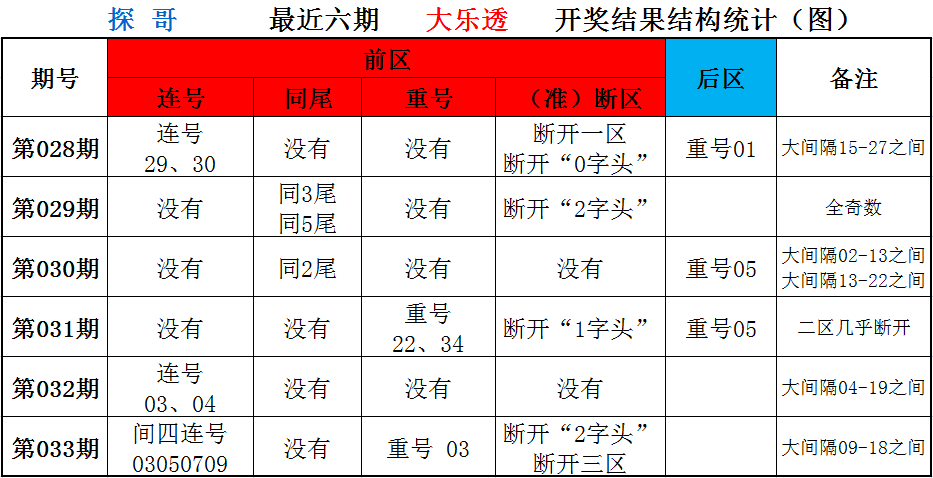 开奖号码结构:前区一对间四连号03、05、07、09,没有同尾,重号03,断开三区。
