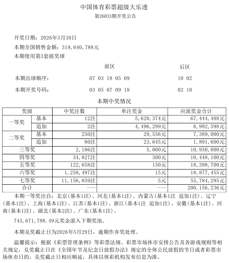 一、上期大乐透第033期开奖结果(历史数据演示):