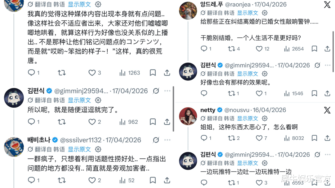 犀牛君专门去翻了X(推特)上韩国网友对节目的高赞讨论,出乎意料的是,在骂得比国内还狠集体处刑男嘉宾的爽评之外,反而有很多韩国人发出理性声音:有人说“他们至少愿意上节目暴露自己的短板而不是厌女”,也有人说“就算行为没啥大碍节目组哄着他们说他们笨拙得可爱也很荒唐”,还有人从母单节目里找到勉励自己的动能“每次看到这种东西都觉得我可以活得更有自信一些”……