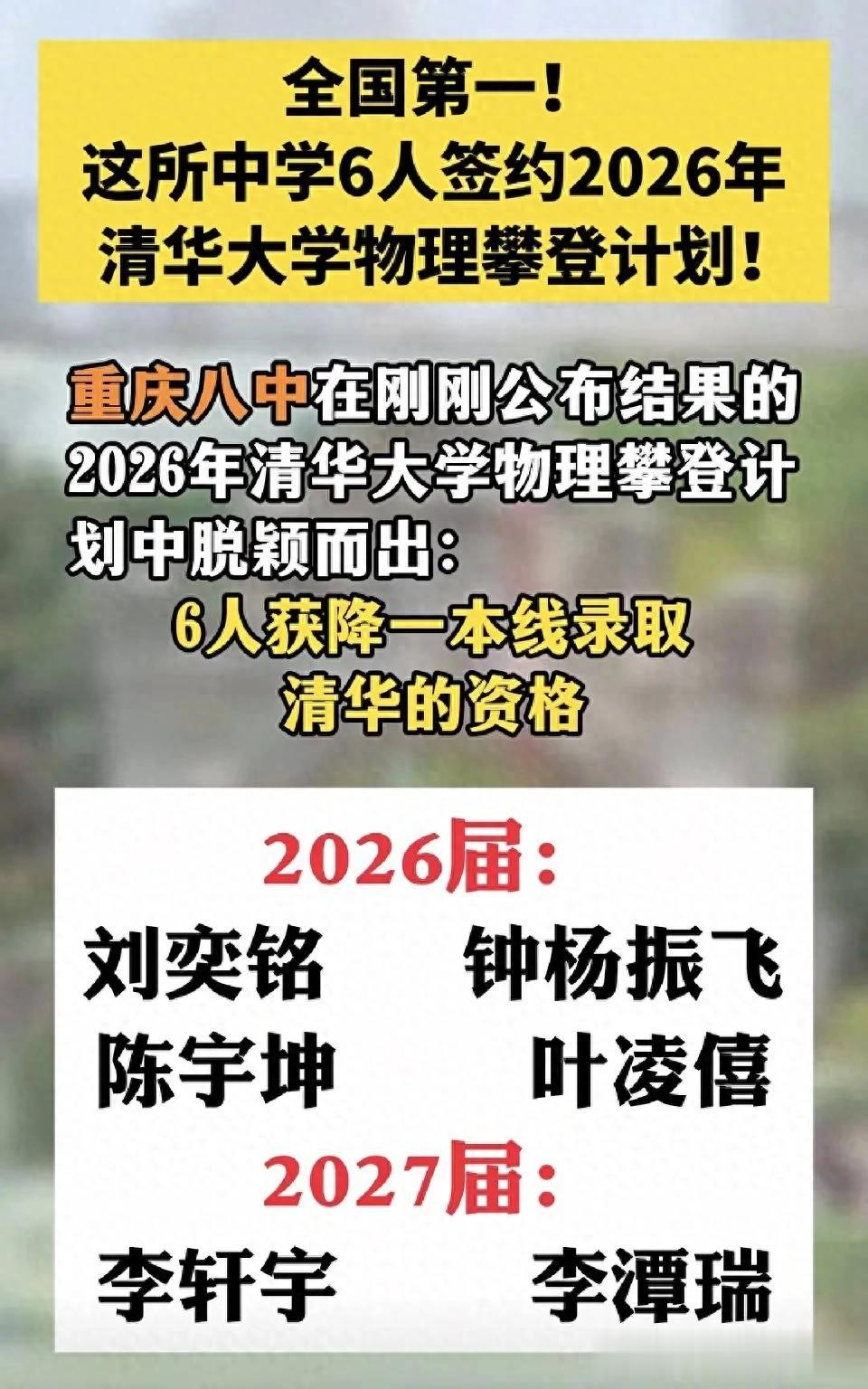 顶尖学府的“直通车”再度刷新纪录——重庆八中6名学子,成功签约清华大学2026年物理攀登计划,一举拿下降一本线录取的资格!这不仅意味着他们提前锁定了清华的“入场券”,更让这所中学登顶“全国第一”的宝座!
