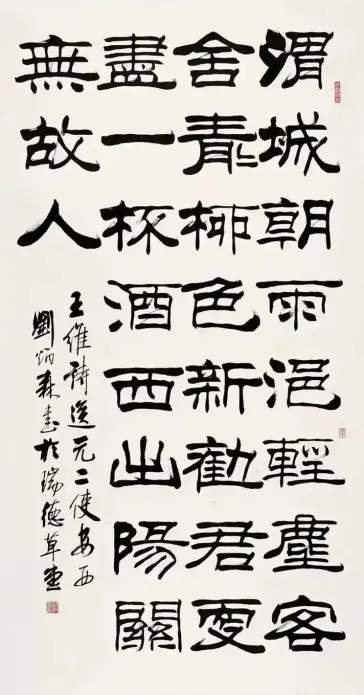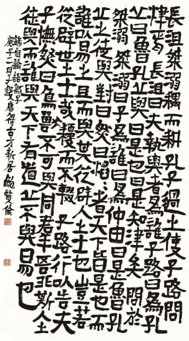 鲍贤伦将《武威汉简》《马王堆帛书》的率真笔意与摩崖石刻的雄浑气势相融合,打破传统隶书横向取势的定式,创造出疏密错落、宿墨块面强烈的视觉语言。他的作品既有古意,又具现代构成感,被誉为“从汉碑秦简中走来的独特韵致”。作为浙江省书协主席,其艺术探索深刻影响了近二十年的隶书创作方向。
