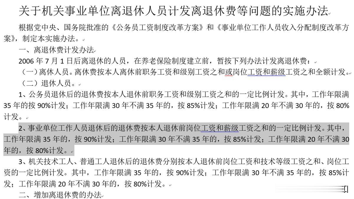 2、事业单位工作人员退休后的退休费按本人退休前岗位工资和薪级工资之和的一定比例计发。其中,工作年限满35年的,按90%计发;工作年限满30年不满35年的,按85%计发;工作年限满20年不满30年的,按80%计发。