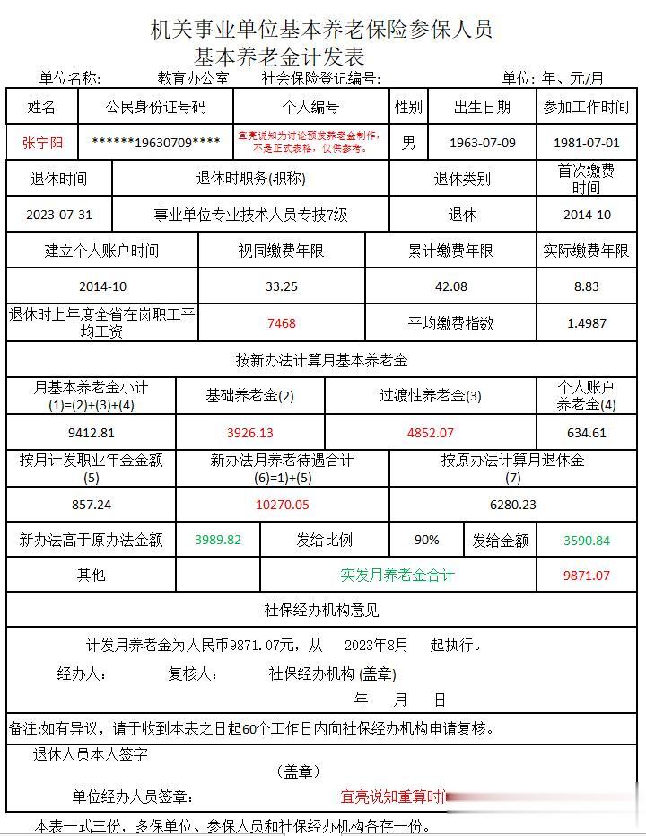 如网上常见的某位退休人员,2023年退休,这是十年过渡期的第九年,按人社部发[2015]28号文的规定:发给退休人员新办法养老金高出老(原)办法养老金部分的90%。这位退休人员使用新办法计算出的养老金是10270.05元;按原办法计算的养老金是6280.23元;新办法高出原办法