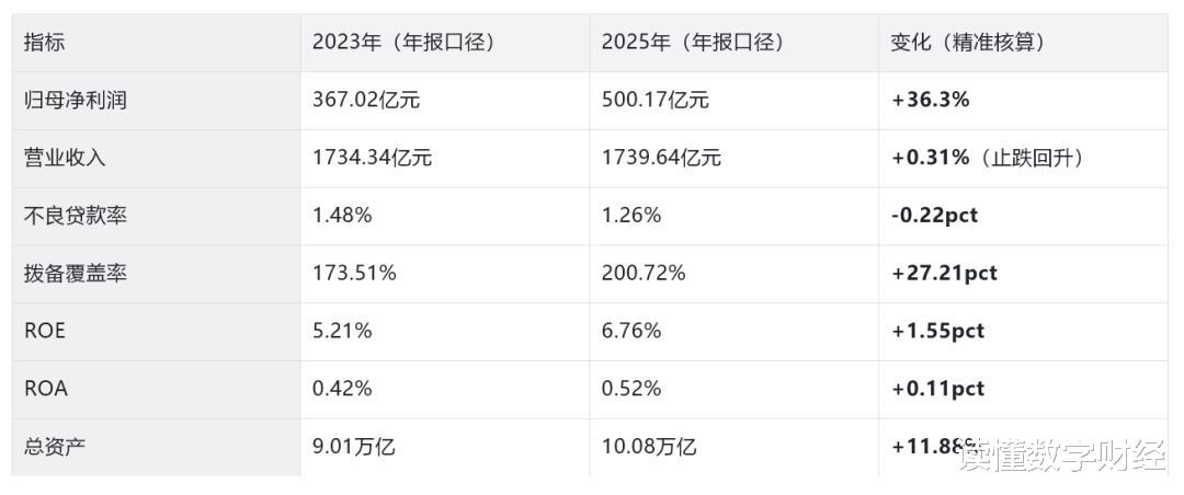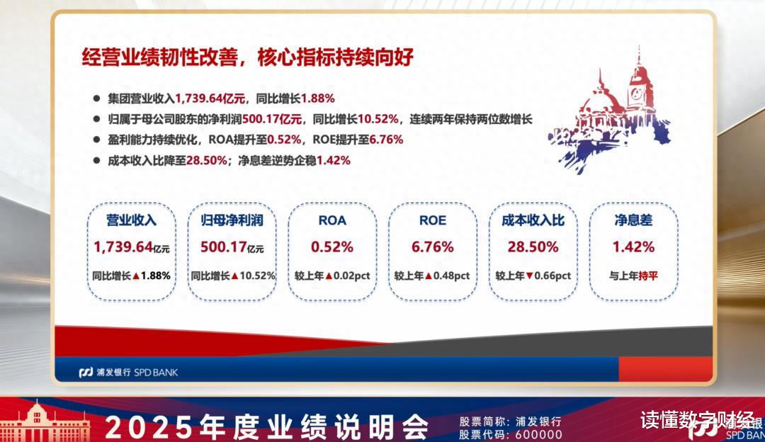 2025年,浦发银行营收同比增长1.88%,逆势取得正增长;归母净利润超 500 亿元,连续两年两位数增长;更难得的是,在全行业净息差收窄的当下,该净息差1.42%,实现了与上年持平,ROA、ROE逆势增长!