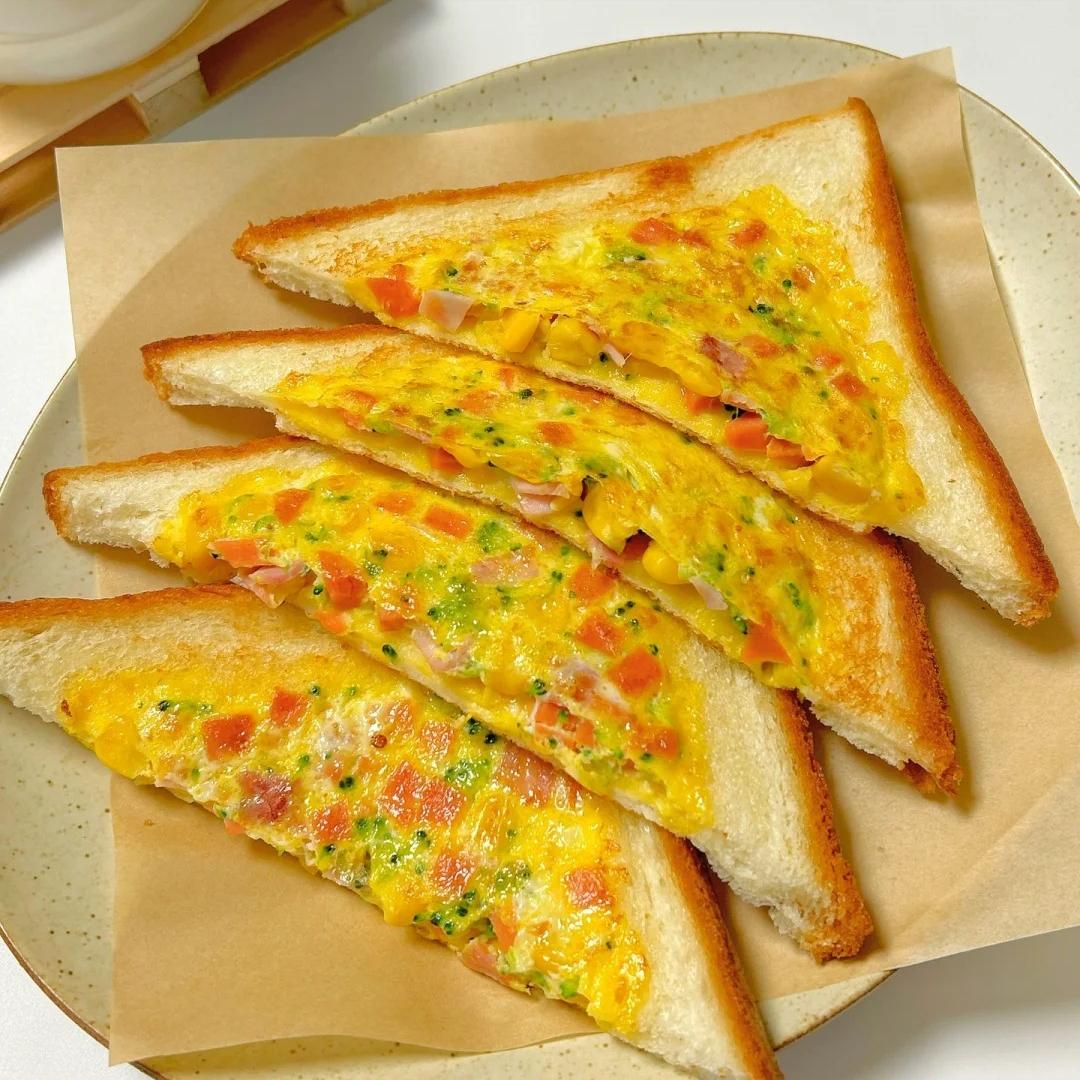 ✅ 亮点:吐司裹蛋液煎到两面金黄,外皮微焦酥香,内里绵软湿润。夹入火腿的咸鲜、玉米粒的清甜和西兰花的脆爽,一口咬下层次超丰富。鸡蛋和蔬菜搭配,蛋白质与膳食纤维都有了,吃完饱腹又轻盈。不费时、不费劲,上班前轻松搞定一份元气早餐。