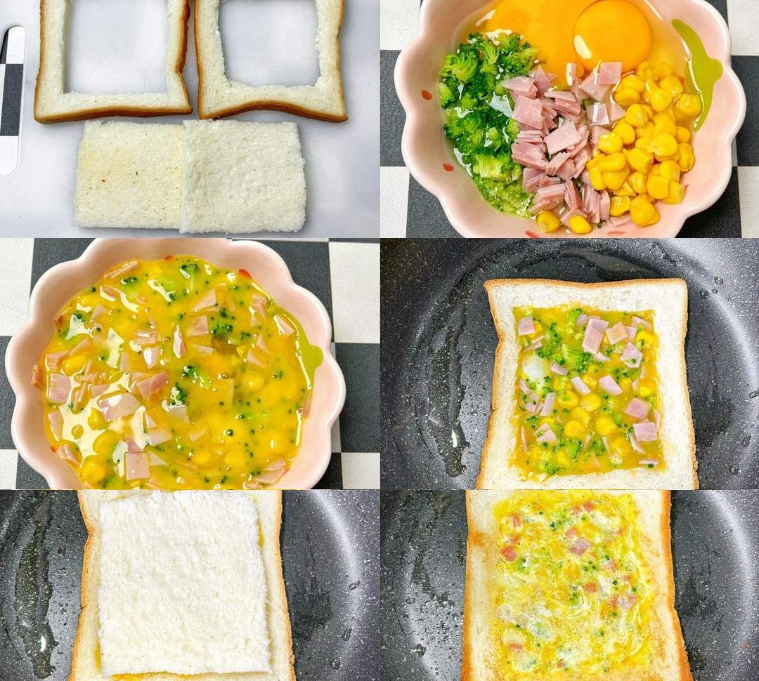 食材:吐司2片、蛋2个、火腿、玉米粒、西兰花