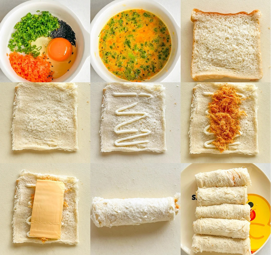2️⃣取一片吐司,去掉四边擀薄,挤上沙拉酱,放上肉松,芝士片,从一边卷起来;