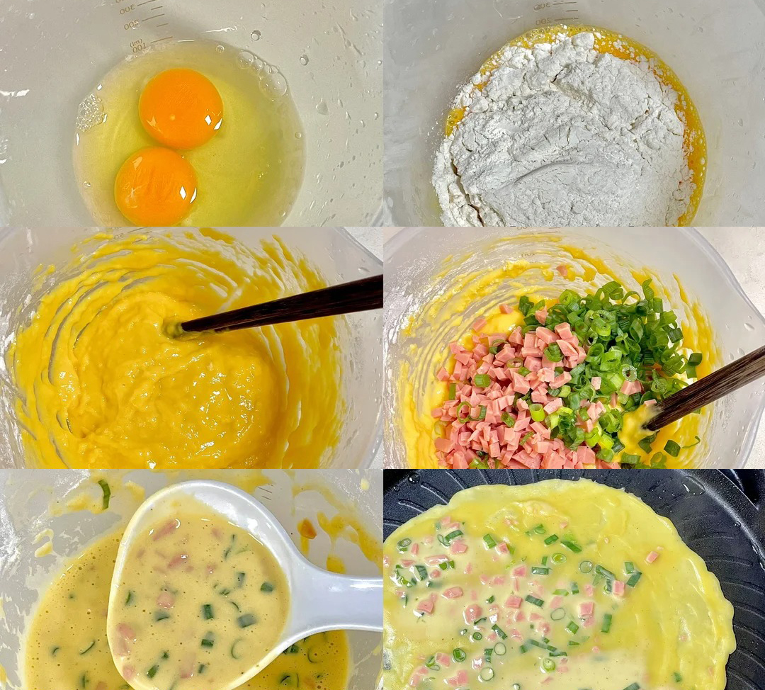 1️⃣碗中打入两个鸡蛋,加入面粉,搅拌成无颗粒状,放入葱花和火腿碎搅匀;