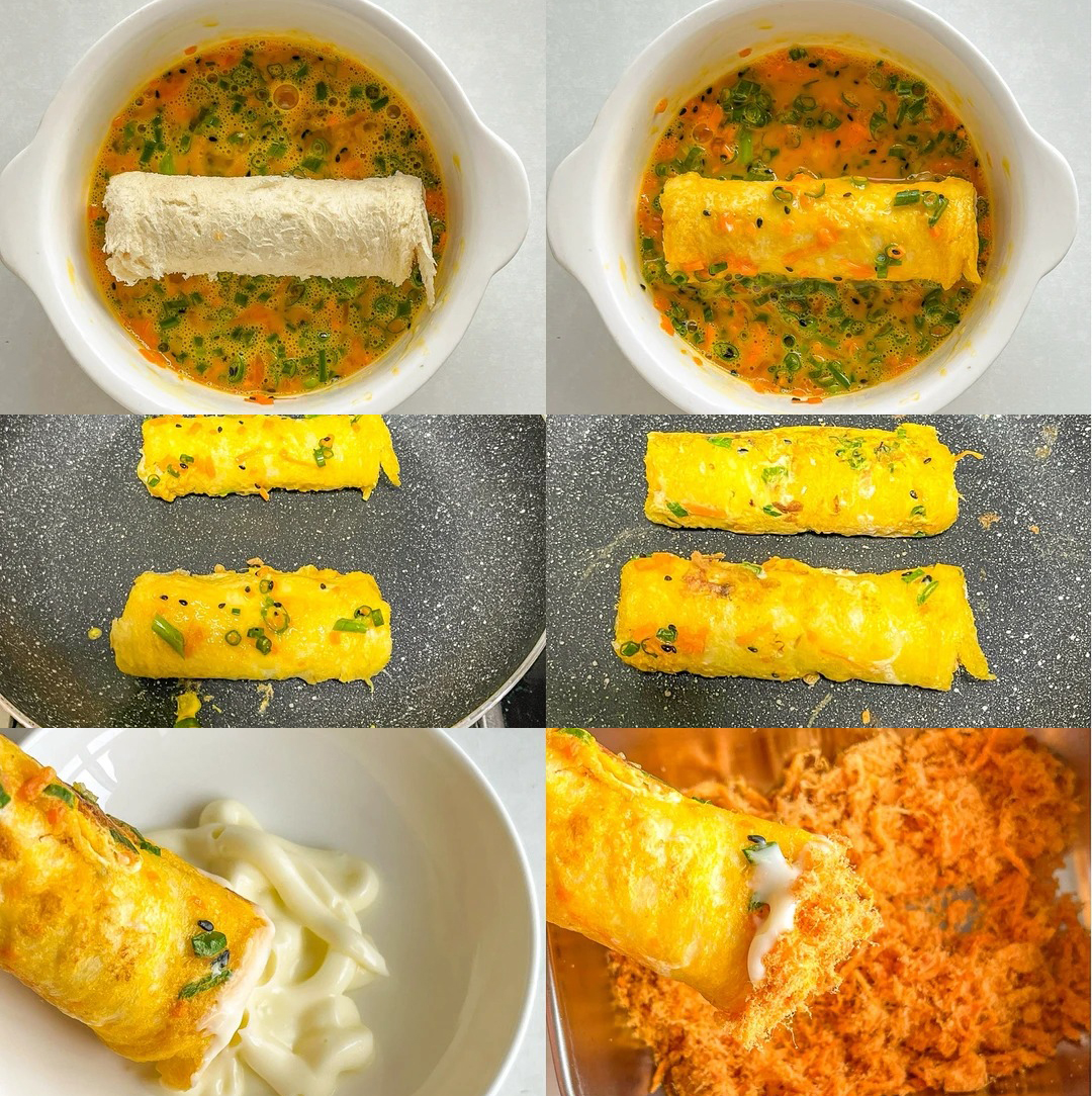 3️⃣把吐司卷放入蔬菜鸡蛋液中浸透,锅中不刷油,放入锅中煎至每个面金黄,两头沾沙拉酱,再沾上肉松就可以了。