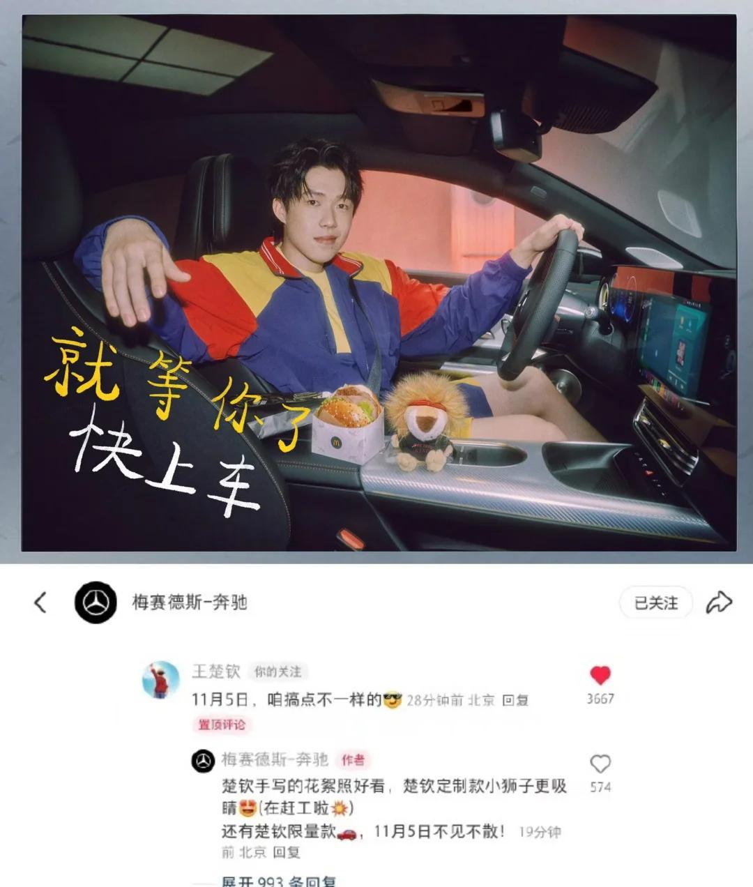 这不,就在今天上午10点,看到王楚钦和奔驰共创的微博,王楚钦说:“终于开着全新奔驰纯电CLA接上了我的堡,休息的时候拍了几张片场花絮照,想说的话都写在上面了。”今天楚钦穿的这一身衣服就很麦当劳,这配色挺好看的啊,青春男大。确实因为麦当劳和奔驰联名,王楚钦拍麦当劳时穿的很奔驰,拍奔驰照片时就很麦当劳了,这个策划很不错哦。