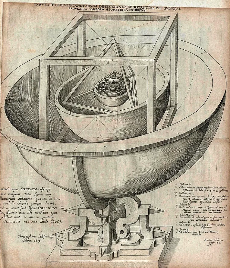 开普勒年轻时信一样东西:宇宙是完美的。他相信行星轨道必须是正圆,因为圆是完美的形状。他还相信行星之间的距离和音乐音阶有关,整个太阳系就是一首神圣的交响乐。这套想法叫"宇宙和谐论"。为了证明这个,他到处求数据。最后求到了当时最牛的天文学家——第谷·布拉赫手里。