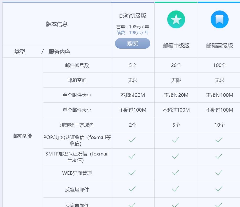 功能精准实用:所有版本均支持无限邮箱空间,单个邮件最大可支持100M,满足大附件传输需求;支持POP3/SMTP加密认证,反垃圾、反病毒功能完善,保障邮件安全;可绑定Foxmail、Outlook、企业微信等多端客户端,适配不同办公习惯。