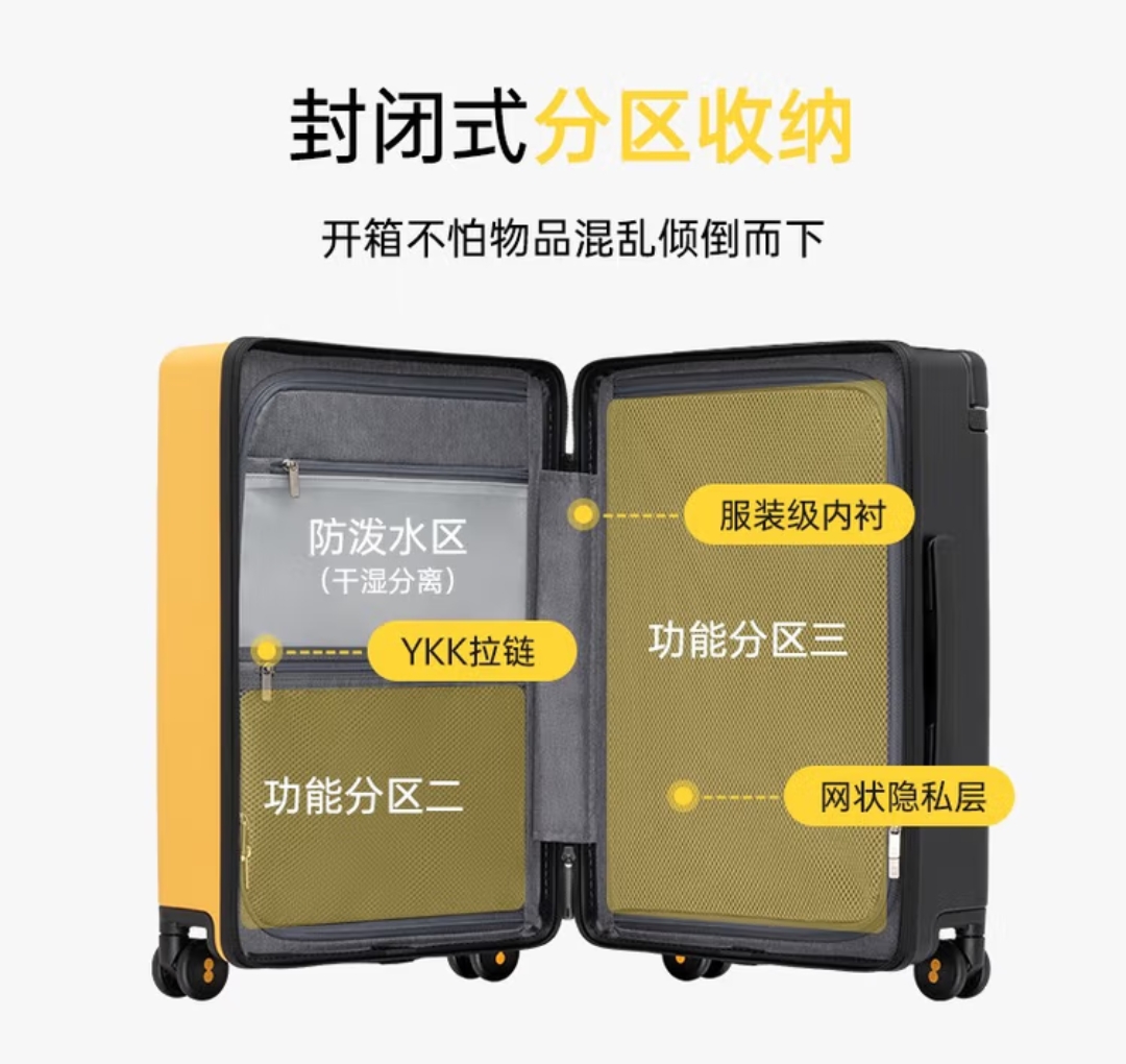 ● 收纳无忧:内部空间采用了封闭式分区收纳,衣物、鞋子、电子产品等可分类放置,取放更便捷,即使在旅途中临时开箱,也不怕物品混乱倾倒而下!