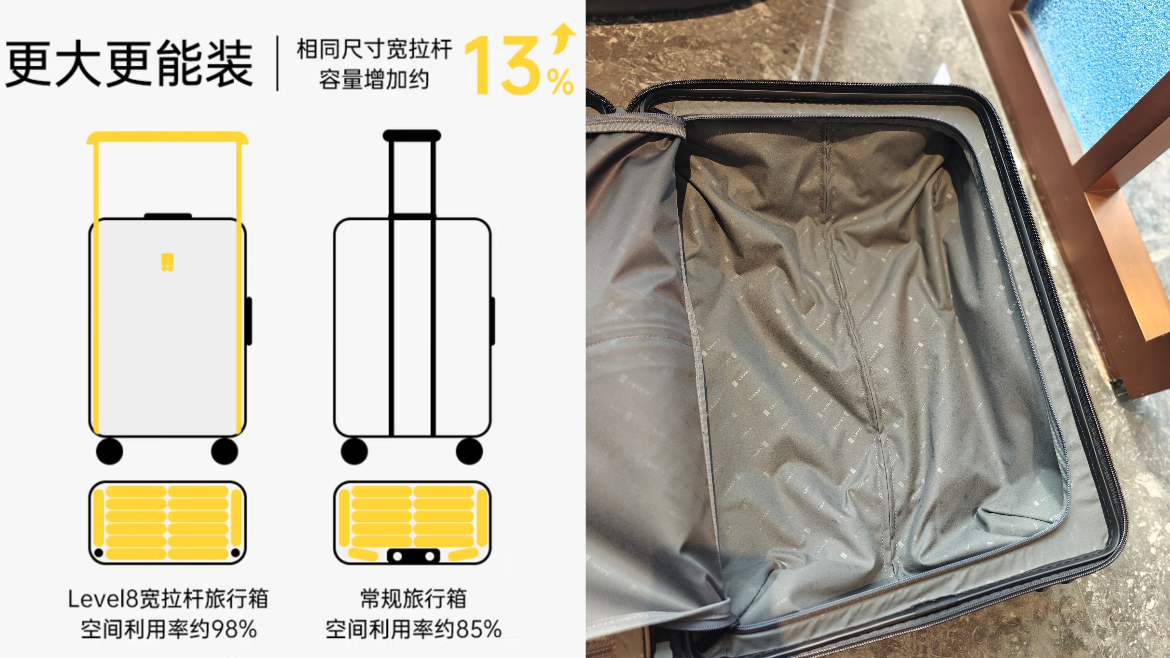 地平线8号大旅行家行李箱采用的是宽拉杆的设计,相比于传统行李箱的常规拉杆来说,更能提升空间利用率并省力:宽拉杆行李箱的拉杆设置在箱子两侧,箱内不再有拉杆占用空间,几乎没有了死角,箱内空间利用率提升13%左右。