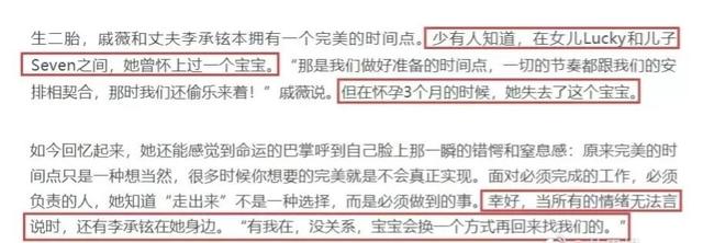 5月15日,戚薇在接受采访时,首次透露了她曾经流产的事,原来在女儿lucky和儿子seven之间,她还怀孕过一次,但比较遗憾的是,在怀孕三个月的时候,她失去了这个孩子。