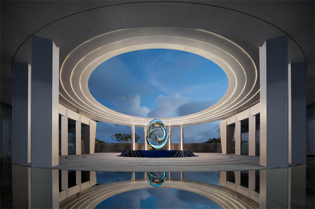 归家体验从入口便已开始。从“天空之环”到入园大堂,形似摇曳凤凰的“极光凤羽”雕塑,从视觉到空间体验,均传递出五星级酒店般的奢华感与仪式感。门前的两株迎客松、对壁的水景“涟漪”,层层递进,沉淀归家时刻的心境。