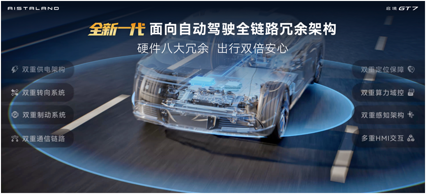 启境GT7拥有同级唯一面向自动驾驶的全链路冗余架构,涵盖感知、计算、供电、转向、制动、通讯、定位及HMI交互八大核心系统的双重冗余设计。即便在极端小概率的硬件失效情况下,车辆仍具备自动靠边停车的Plan B。