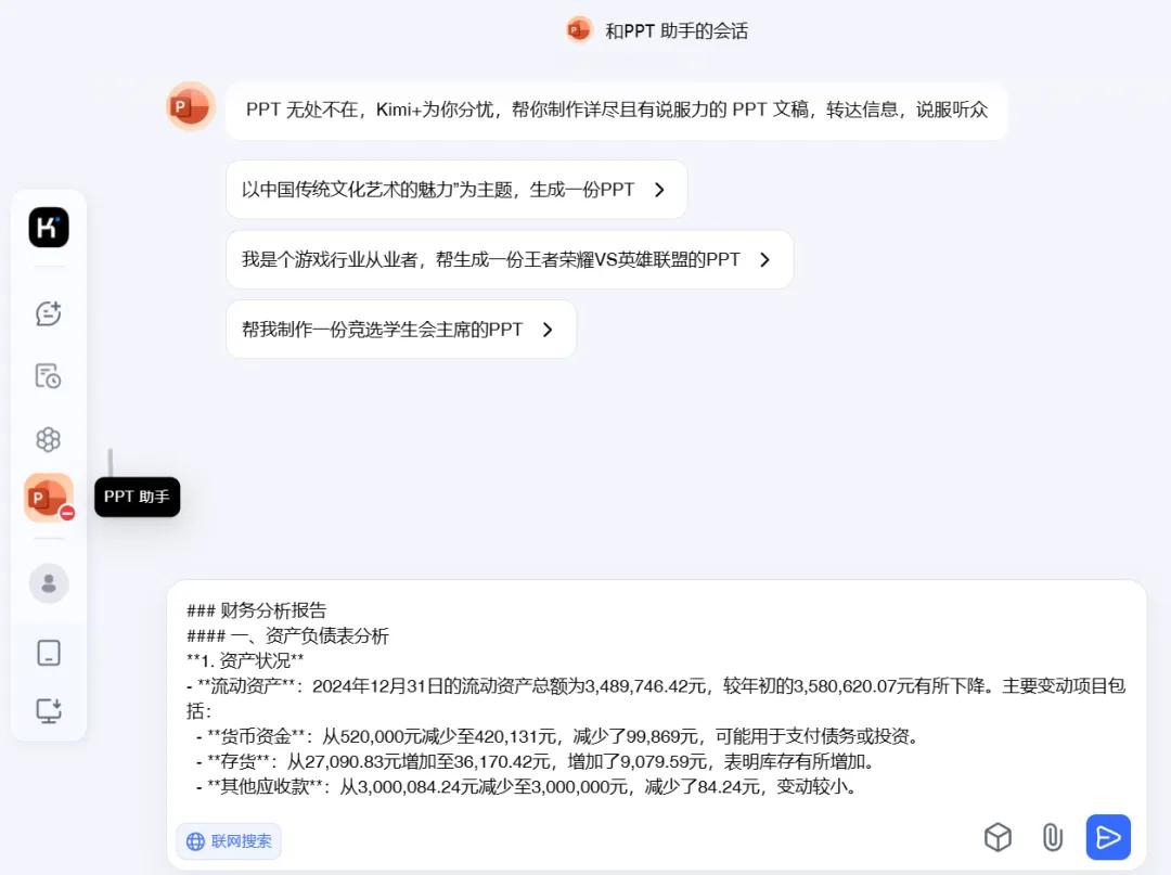 2.一键生成PPT首先,我们打开Kimi官网,找到PPT助手,我们将刚才生成的数据分析报告,输入到对话框中,并发送。