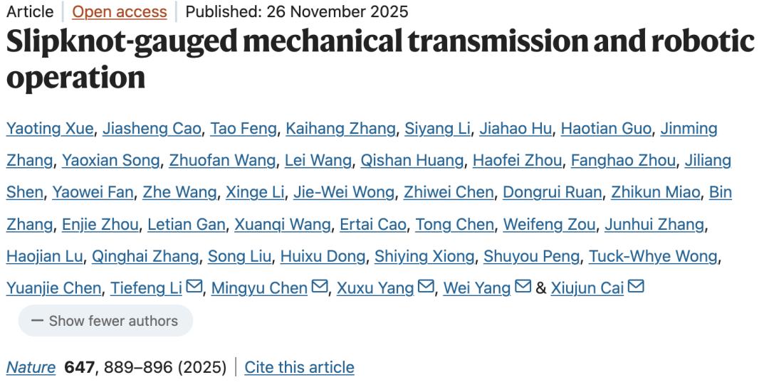 11月26日,Nature发表了一项由浙江大学团队发表的研究。标题极其质朴:Slipknot-gauged mechanical transmission and robotic operation(活结机械引导力传递与机器人操作)。这项巧妙的研究,利用一种看似简单的“活结”结构,实现了高精度、可编程的力信号传递,为手术机器人、微创手术和资源匮乏地区的医疗操作提供了全新解决方案。