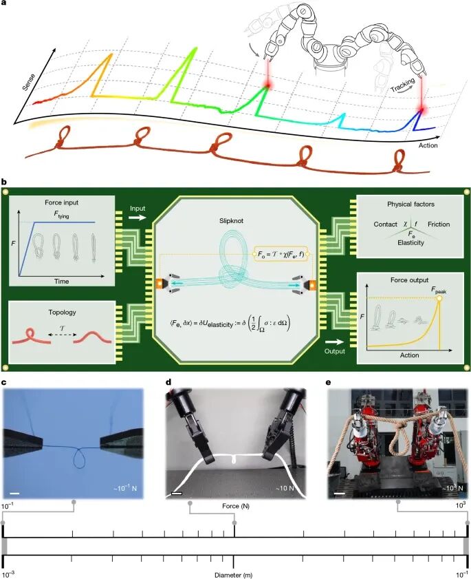 利用活结作为机械信息传感单元,实现机器人精准力操控。其核心在于将打结力作为信息“写入”活结,再通过解结时的峰值力“读取”信息,最终在微操作、协同作业及重载救援等多种场景中实现对机器人操作的智能反馈与精准控制
