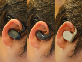 不入耳式耳机本质上就是尽可能把单元贴合佩戴在耳边获取最大的音质效果,从下方佩戴图来说,飞利浦A6708由于可调节范围精细,所以基本上可以伸进到耳廓内。韶音openfit因为小巧也可以佩戴非常贴合,唯独Cleer arc II耳机的腔体太大,加上是弹簧结构导致比较压耳廓软骨。