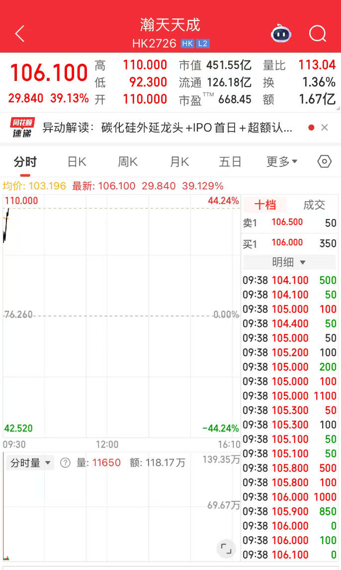 上市首日,瀚天天成股价大幅高开。早盘股价一度涨至110港元,较发行价上涨约44%;另有行情显示,按开盘价计算,公司总市值约451.12亿港元。