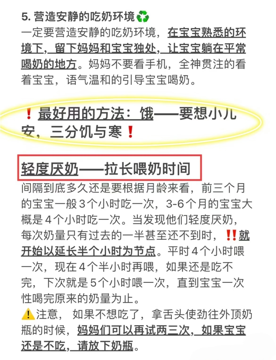 原来是3小时一喂,试着拉到3.5甚至4小时。让宝宝真正体会到“饿”的感觉,他才会认真吃。
