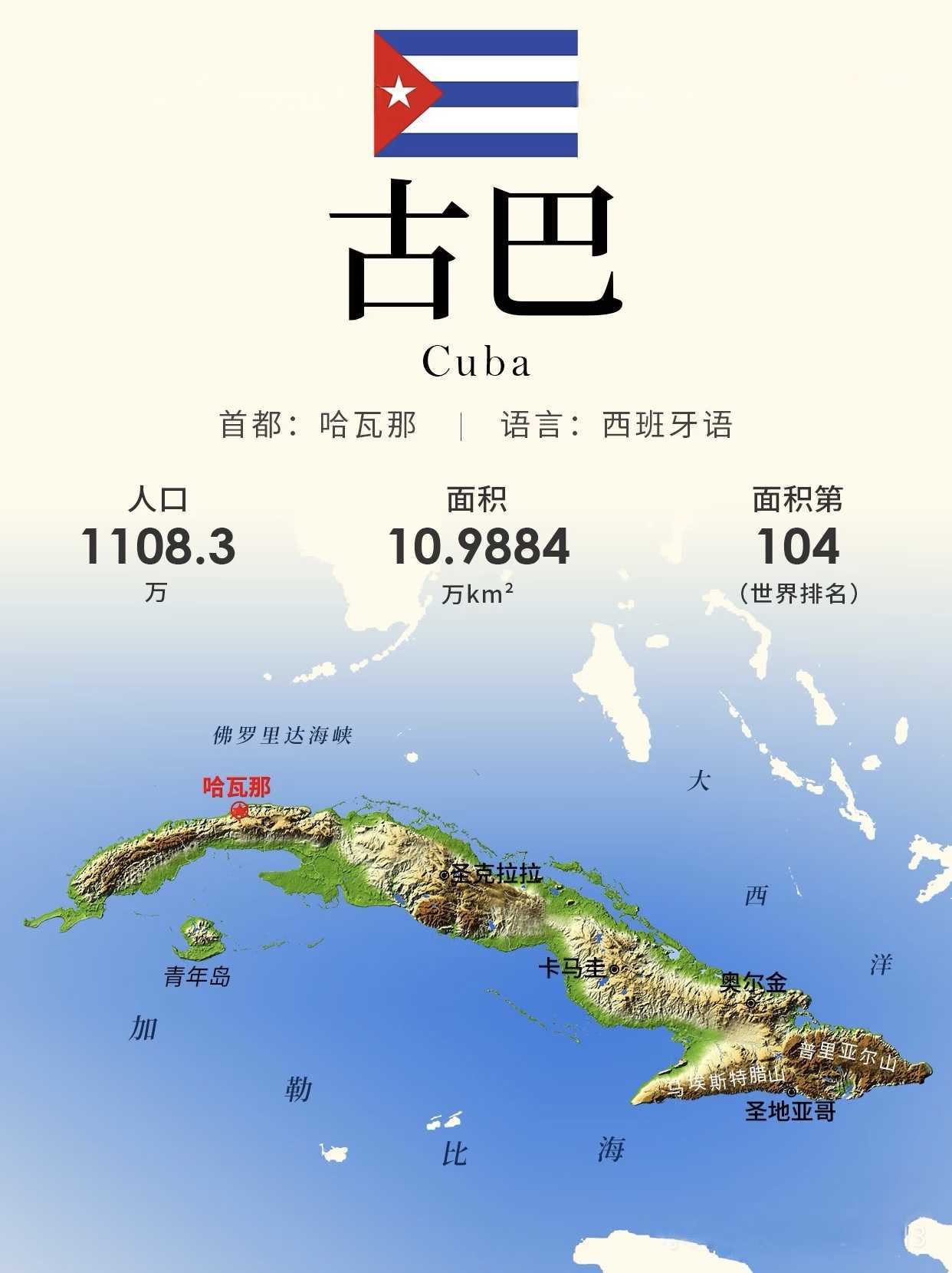 位于北美洲加勒比海西北部的古巴,由古巴主岛、青年岛等1600余座岛屿组成,是西印度群岛中面积最大的岛国。全国共划分为15个省和1个特区(青年岛特区)。人口以西班牙后裔、非洲后裔、混血人种为主,官方语言为西班牙语,主要宗教为天主教。
