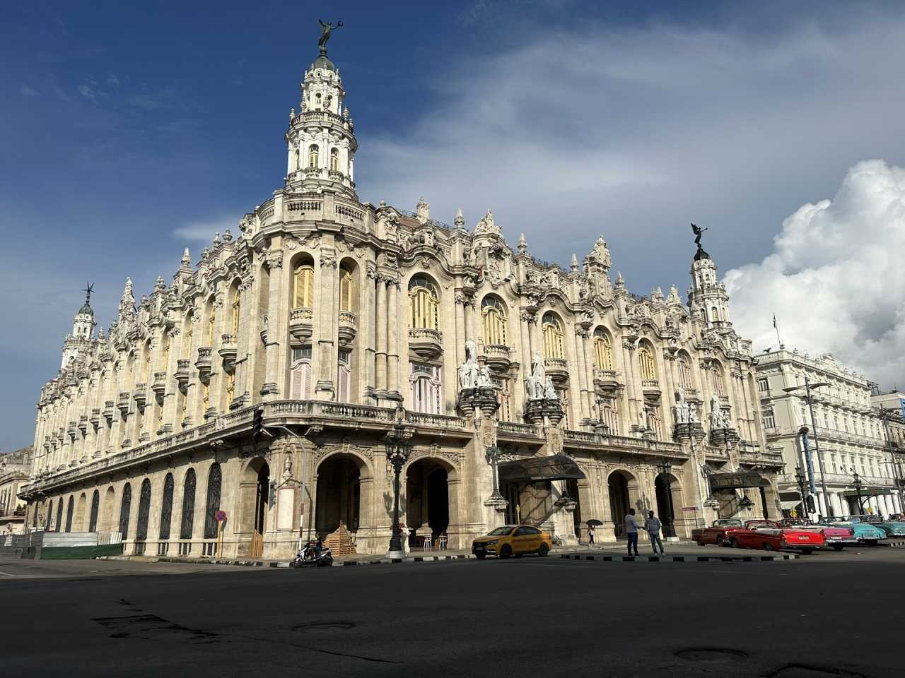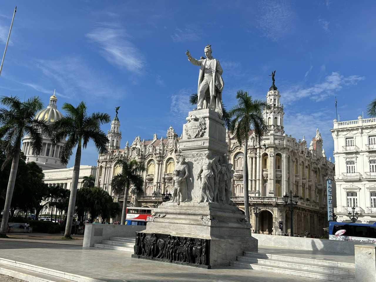 雕像后方是哈瓦那大剧院(Gran Teatro de La Habana),以其华丽的新巴洛克风格立面和顶部的胜利女神像闻名。