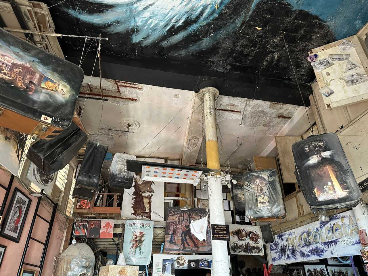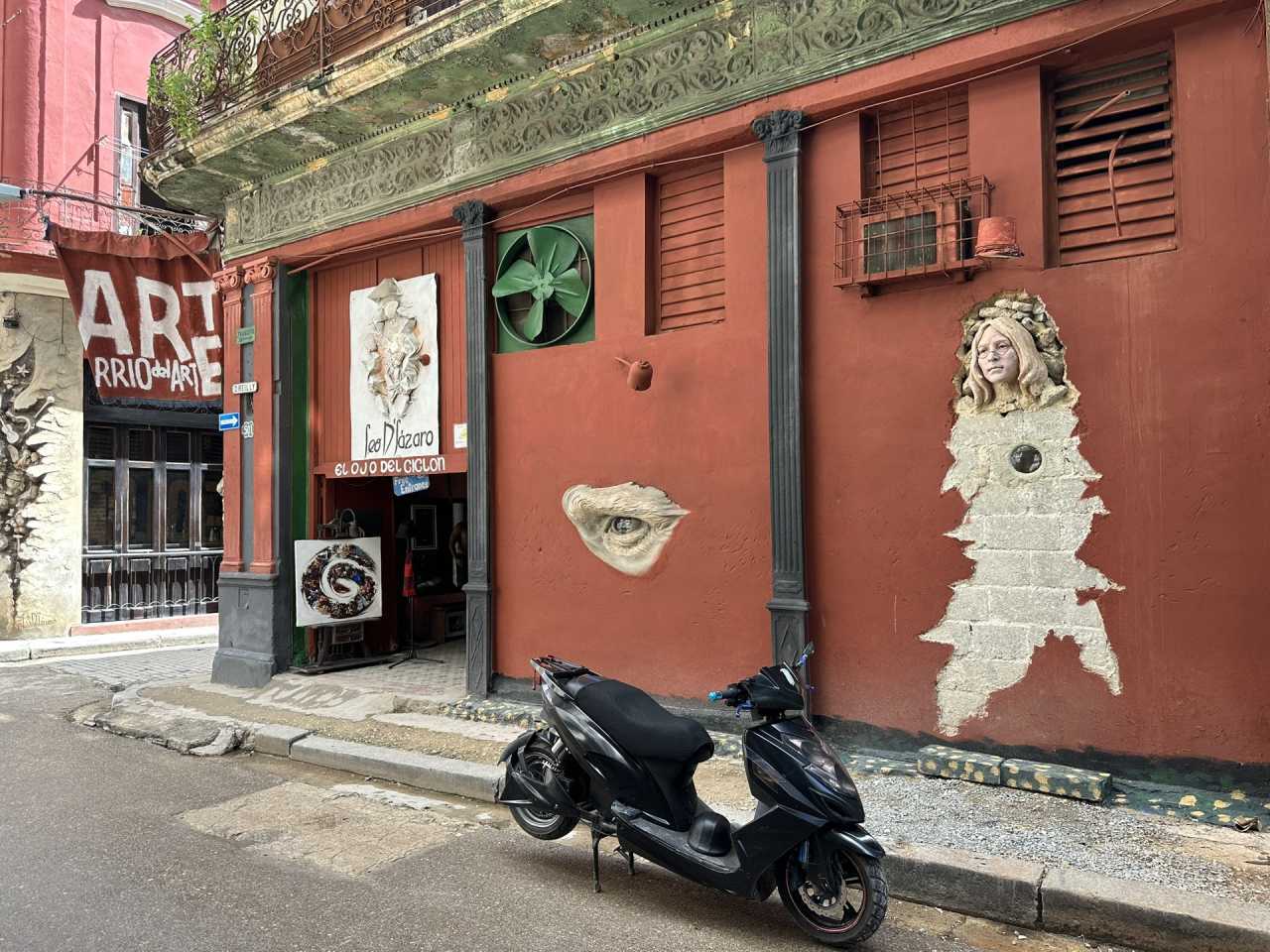 这是位于哈瓦那老城区的艺术家 Leo D’Lázaro 的工作室兼画廊——“El Ojo del Ciclón”(飓风之眼)。赭红色的外墙在殖民风格的街区里格外醒目,而墙面上的装置艺术更具冲击力:一只眼睛仿佛从墙体里“破茧而出”,逼真得令人心悸;另一处剥落的墙皮之下,一个女性雕塑头像若隐若现,超现实的张力瞬间将人拉入他的艺术叙事。