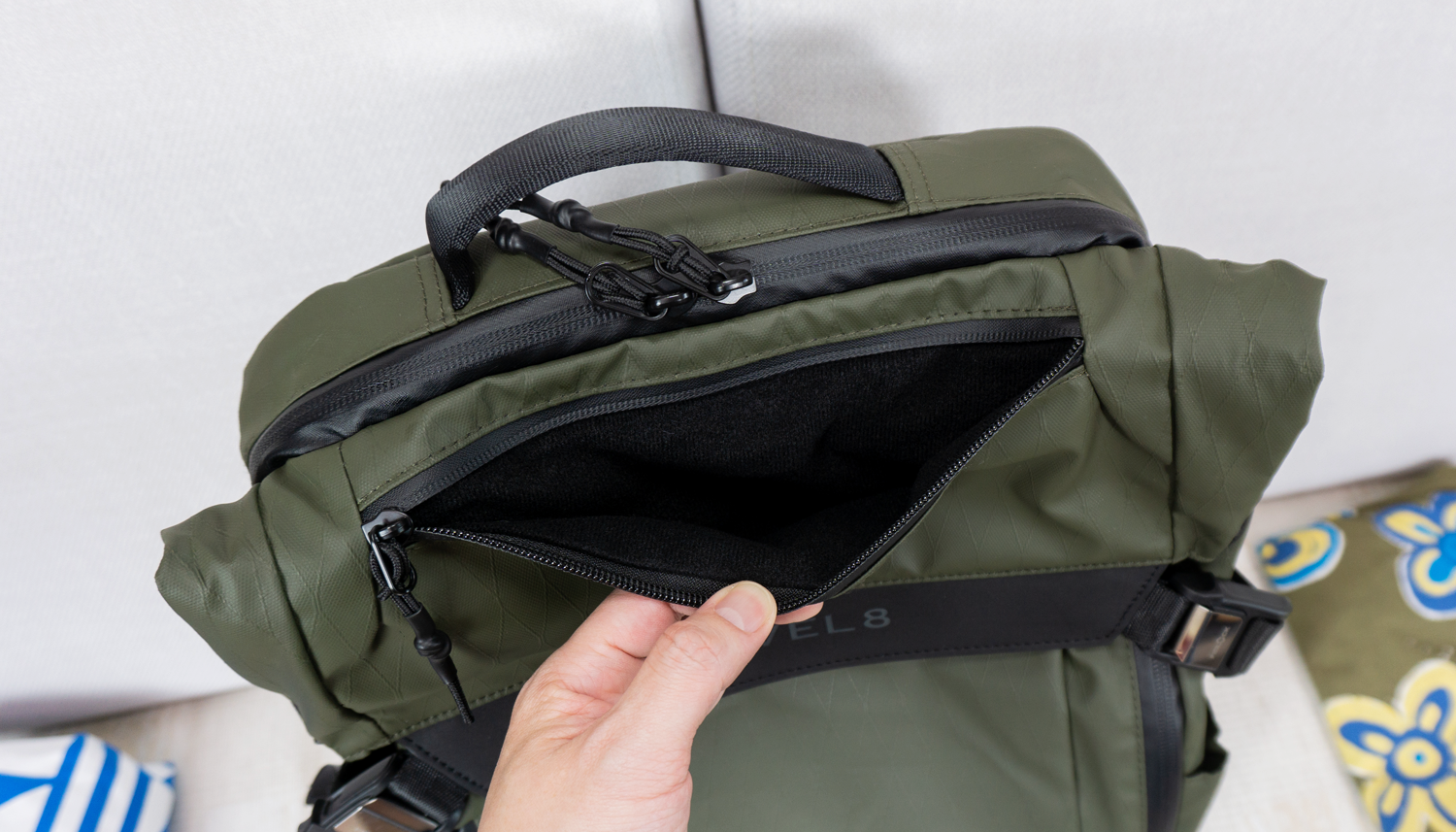 包体顶部的独立拉链袋设计得十分用心,内部采用了柔软的绒面材质,手机、眼镜这类易刮花的物品放进去也完全不用担心被划伤。