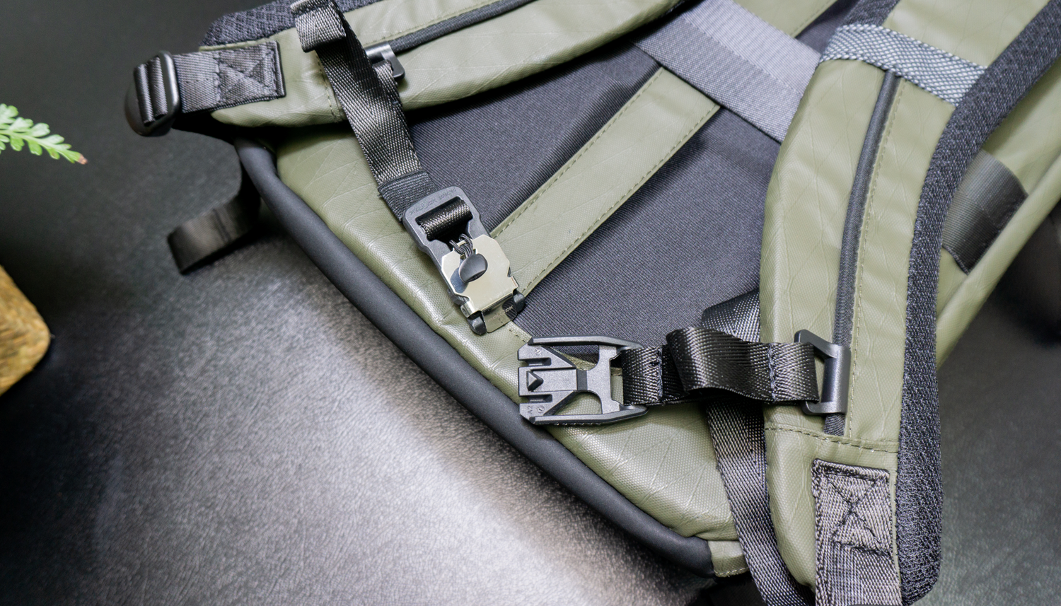 它的磁吸巧思不只用在主扣上,肩带区域由蝴蝶扣+Fidlock磁扣组成的胸扣也是同样的思路。手指轻拉织带即可快速解开,往胸口一搭便自动吸附复位,稳稳贴合身体,将背负压力巧妙地分散开。
