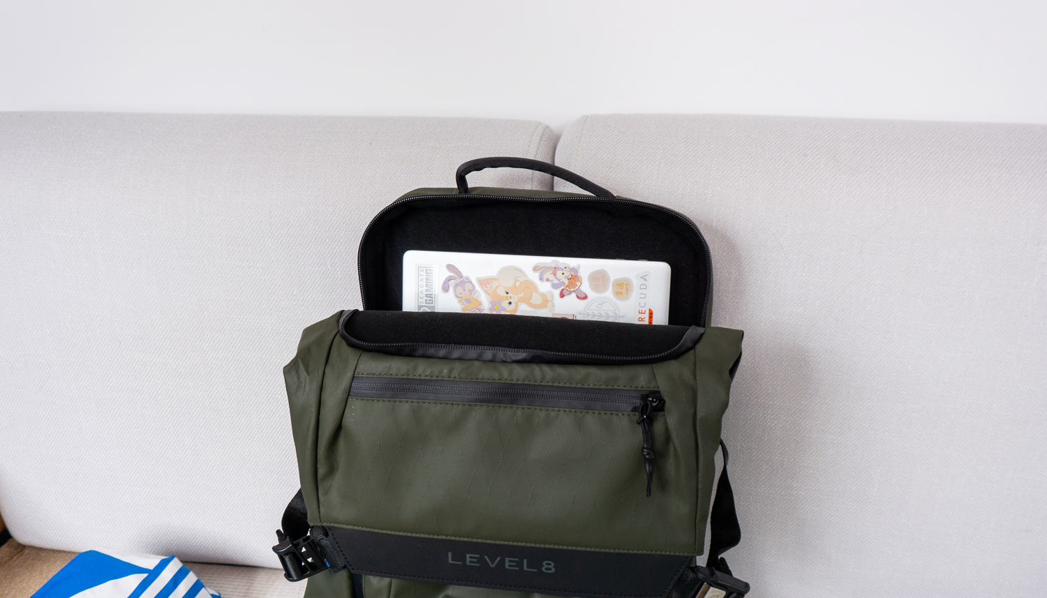 外观方面,整个背包的设计非常克制,没有一点多余的装饰,仅在翻盖处压印了一个“LEVEL8”皮革logo。仔细看它的走线和各处拼接,处理得都相当规整,能感受到做工上的用心。