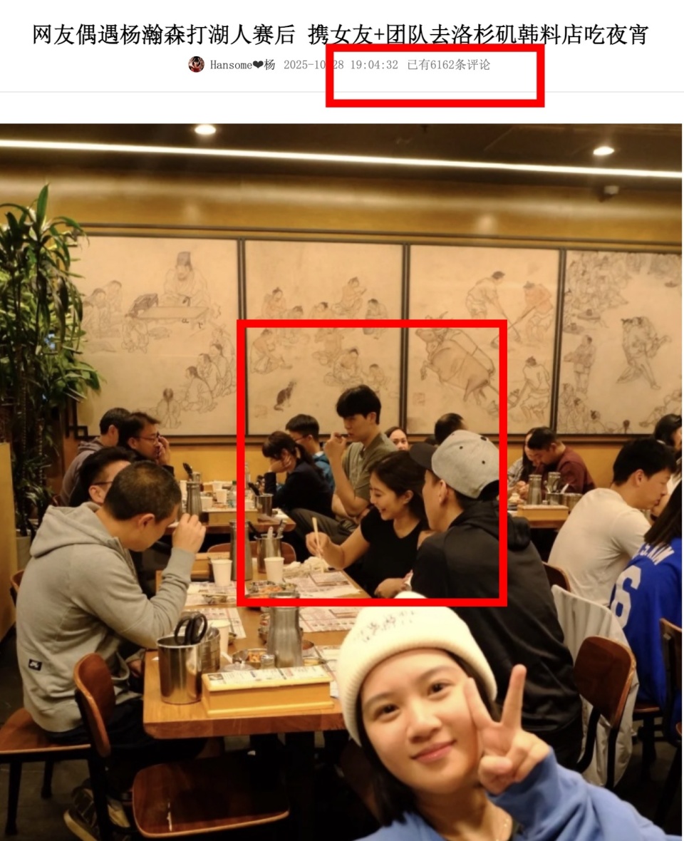杨瀚森在NBA的起步似乎并不顺利,他在前几场常规赛中的数据表现平平,未能达到国内球迷的殷切期望,随之而来的是持续不断的批评声音。围绕他的讨论因为其场外生活而进一步升级。球迷在网络上公开了杨瀚森在洛杉矶打完湖人比赛后与身高173厘米的女友一同吃宵夜的多张照片,这一举动迅速引发了全网的热议,国内平台一条贴文评论也是超过了6000条。许多观点认为,对于一个刚满20岁的年轻运动员而言,他在时间管理方面显然还需要大幅提升,需要平衡个人生活与高强度的职业训练,现阶段谈恋爱必定会占据他每天不少的时间,影响他宝贵精力,毕竟NBA的竞争环境远非国内联赛可比。(数据来源@直播吧)