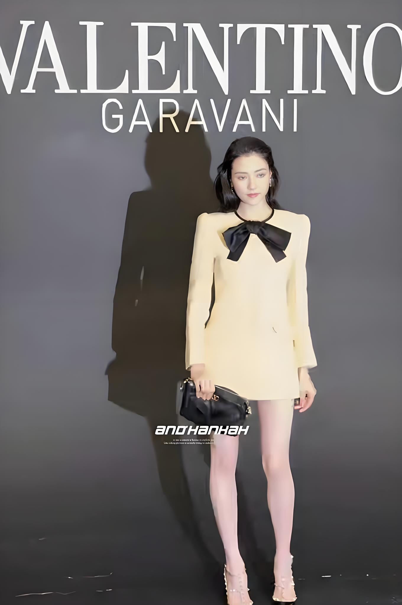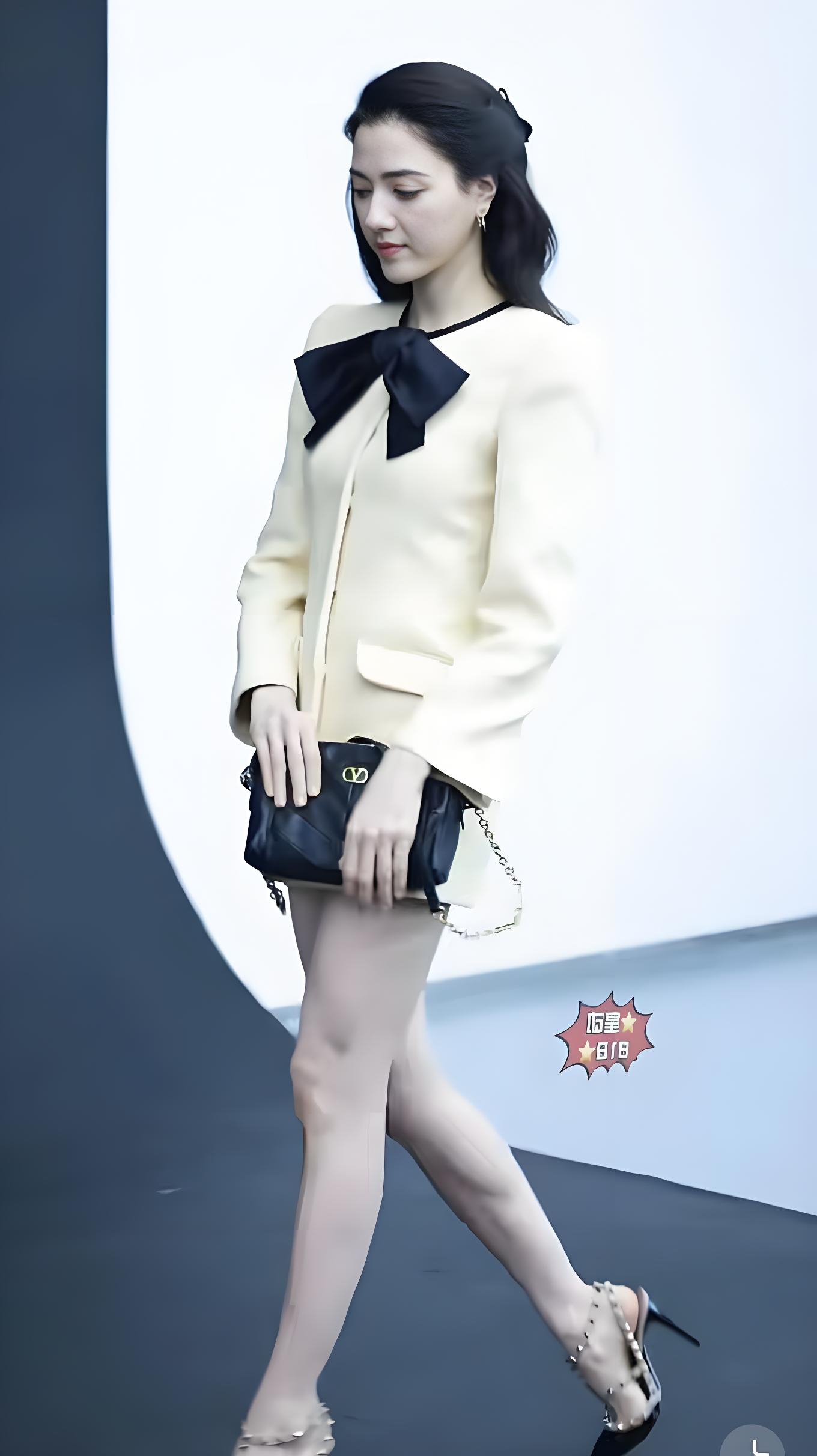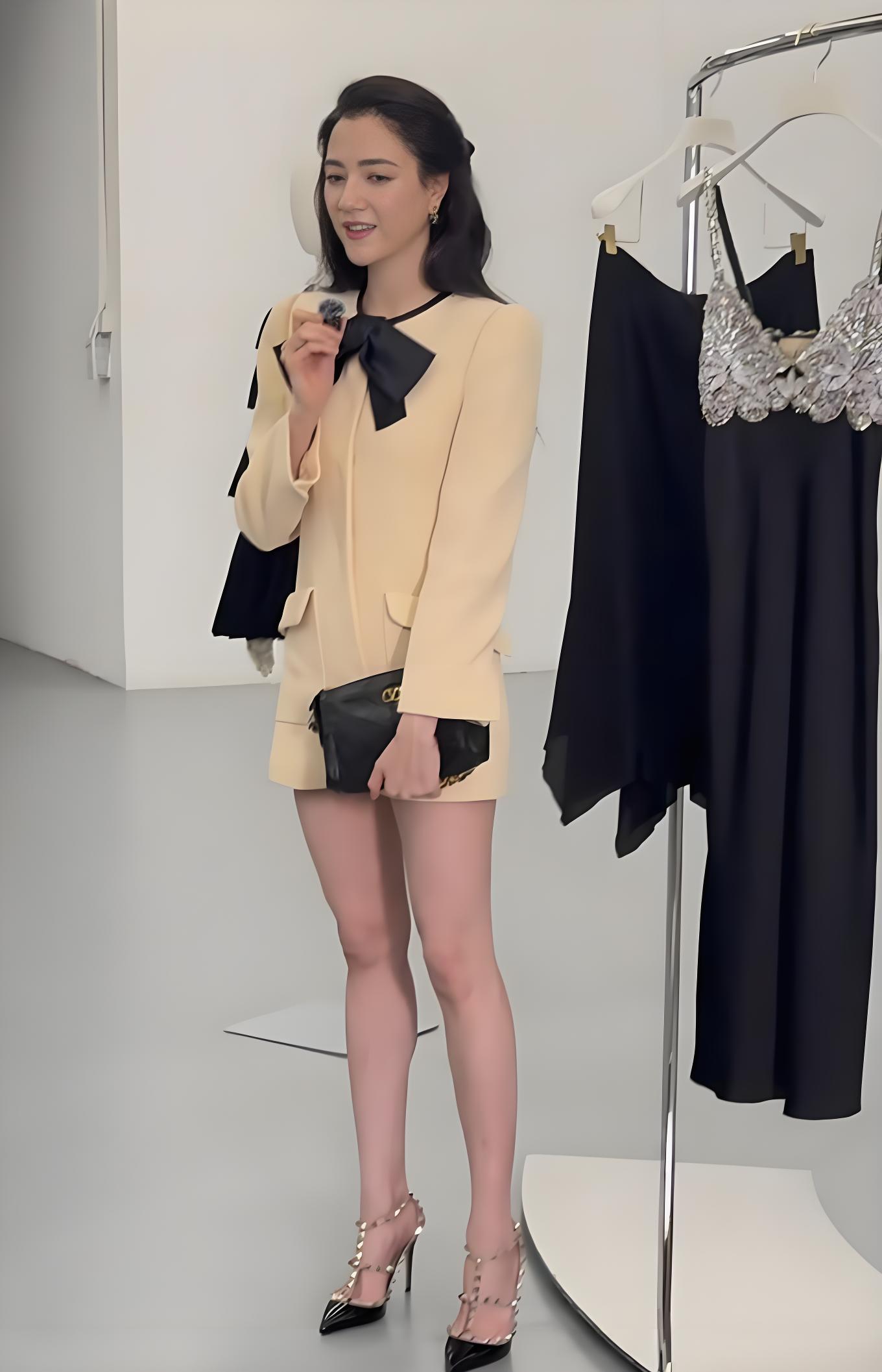 这套西装裙的设计堪称一绝。收腰剪裁恰到好处,完美地勾勒出娜然纤细的身形,将女性的柔美线条展现得淋漓尽致;垫肩设计则增添了几分霸气,让她气场全开,仿佛自带光芒。而最引人注目的当属那个大尺寸黑色缎面蝴蝶结领结,它宛如点睛之笔,在干练的风格中巧妙地融入了甜美元素,使得娜然又美又飒,活脱脱就是从童话中走出来的“富家千金”,举手投足间尽显优雅与高贵。