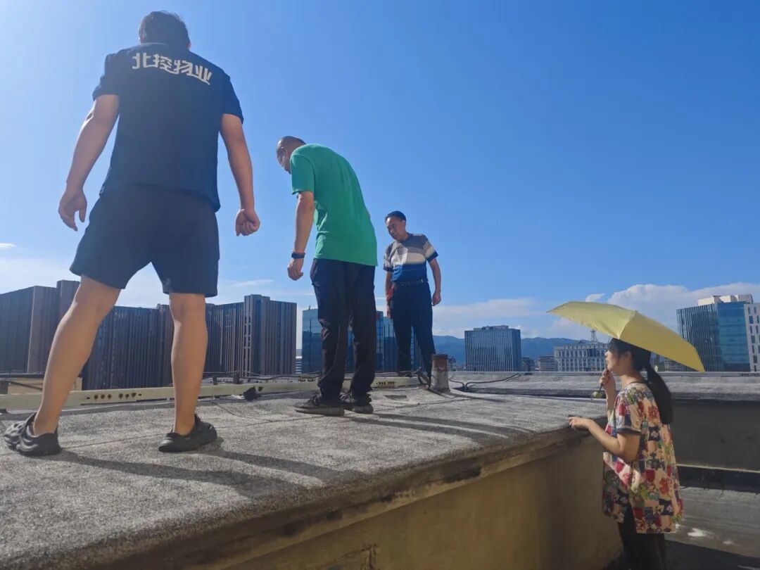 维修工作迅速启动。经查,楼顶原有防水层严重老化、多处开裂。施工人员重新铺设防水材料解决阳台漏雨,高空作业人员在楼侧墙体刷防水胶解决卧室漏雨。赵芳多次到现场查看进度、协调问题,确保维修高效推进。最终,汛期前佀先生家的漏雨问题彻底解决。