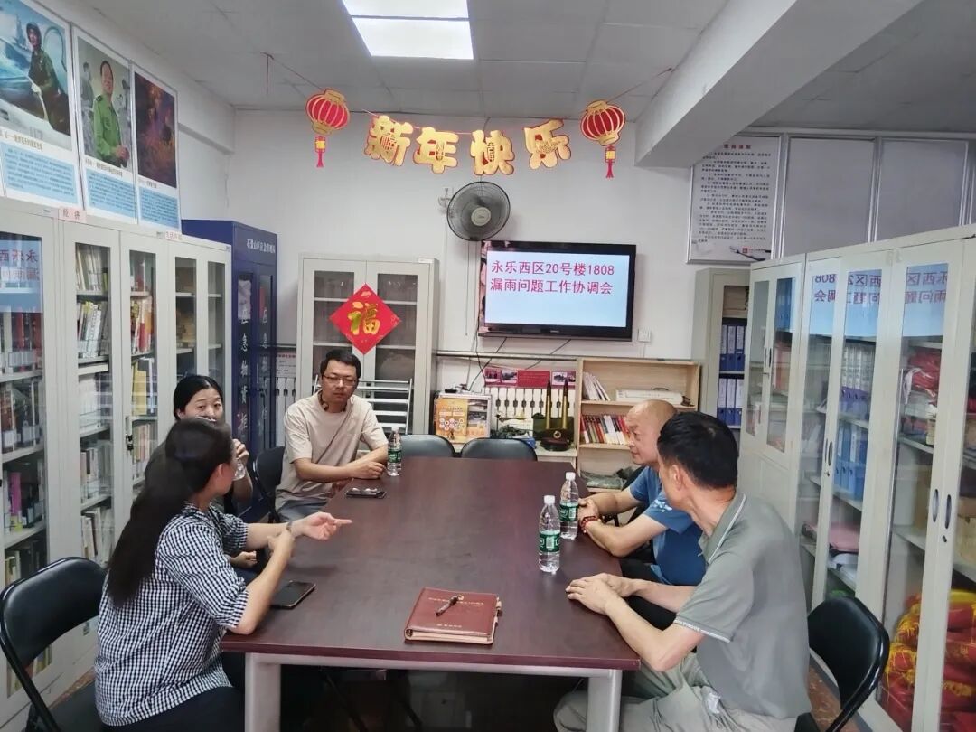 考虑到顶层漏雨涉及屋面防水、物业维修、老旧改造等多重因素,社区坚持党建引领,通过党建工作协调委员会,召集广电琼芳物业、北控物业、老旧改造施工方等共同商议。经反复协商,明确分工:广电琼芳物业为维修主体,北控物业提供技术支持,老旧改造施工方排查结构隐患并修复户内墙皮,社区全程协调跟进。