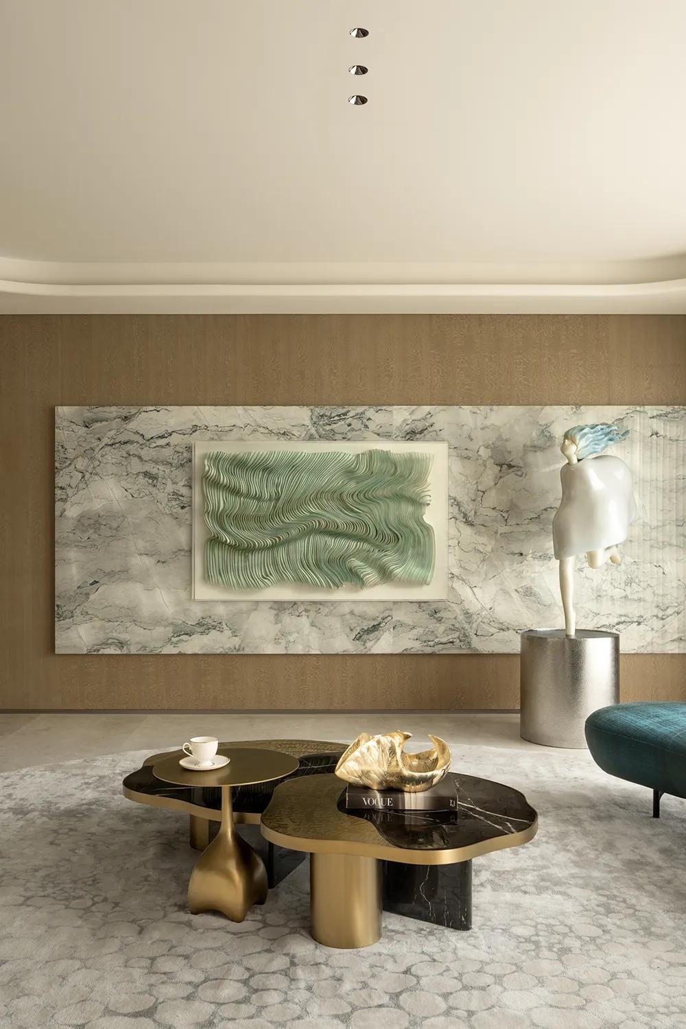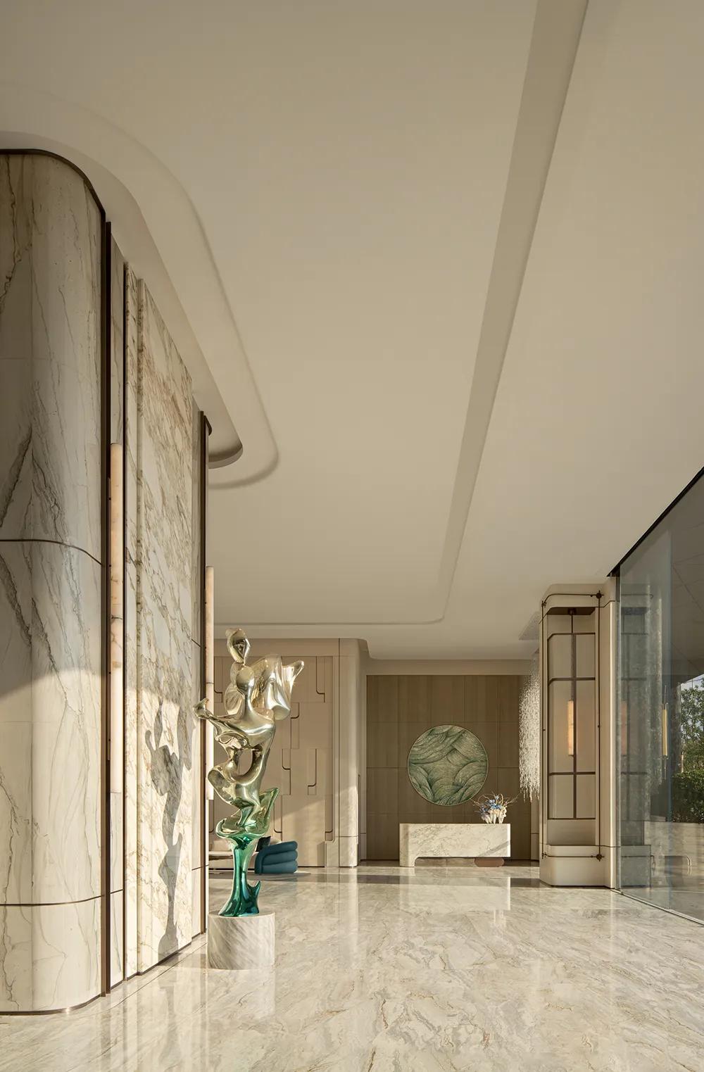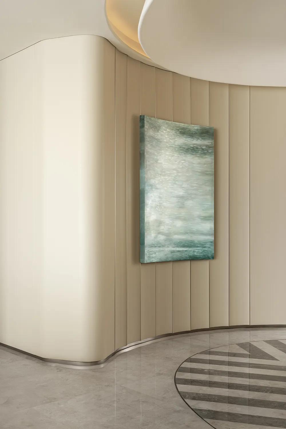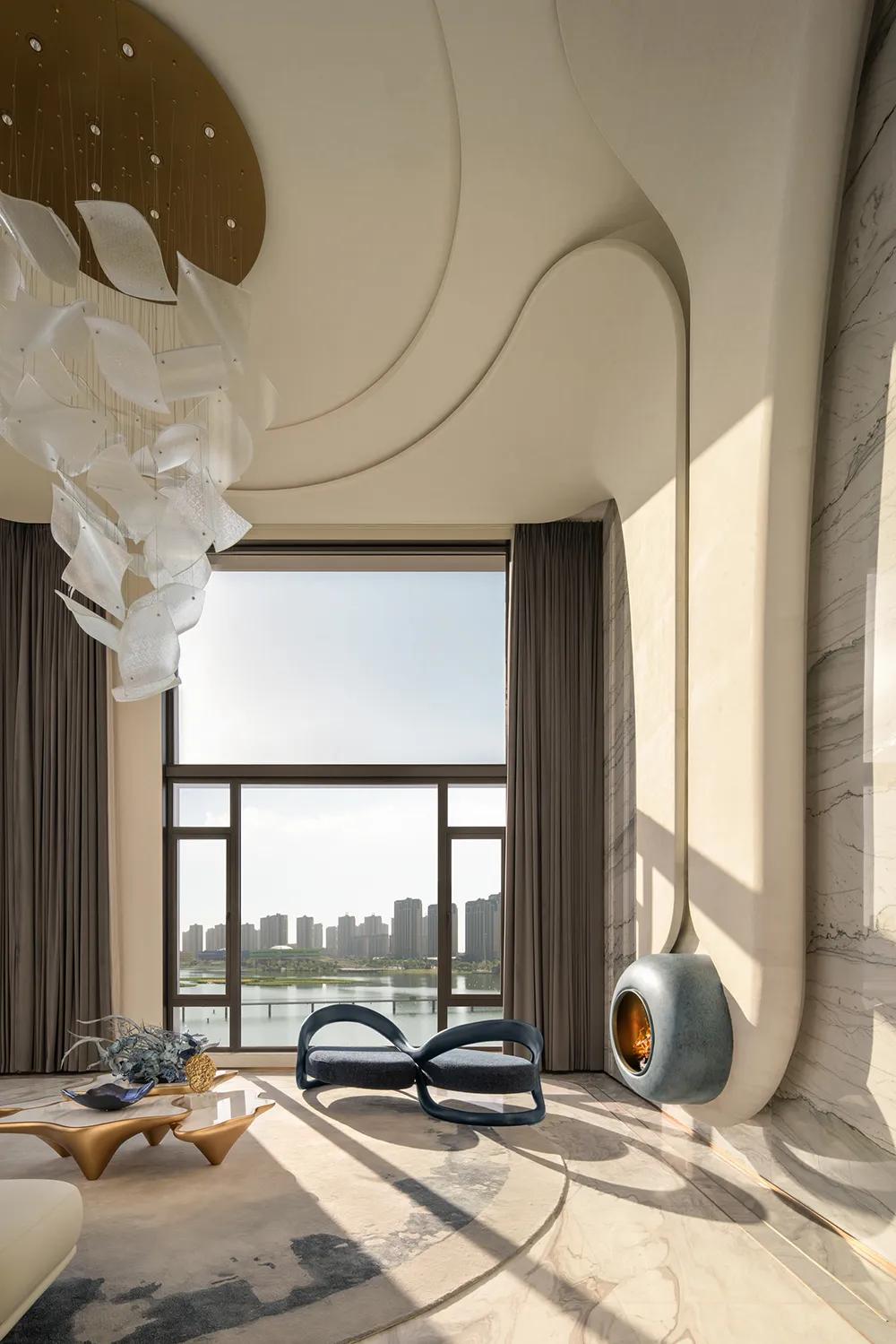 270°观景界面将湖景最大限度地引入室内,特殊艺术涂料在柔光中呈现近似洞石的细腻肌理,让山海之间潮汐、水雾与岩层的自然印象,转化为空间内部更安静的流动语言。