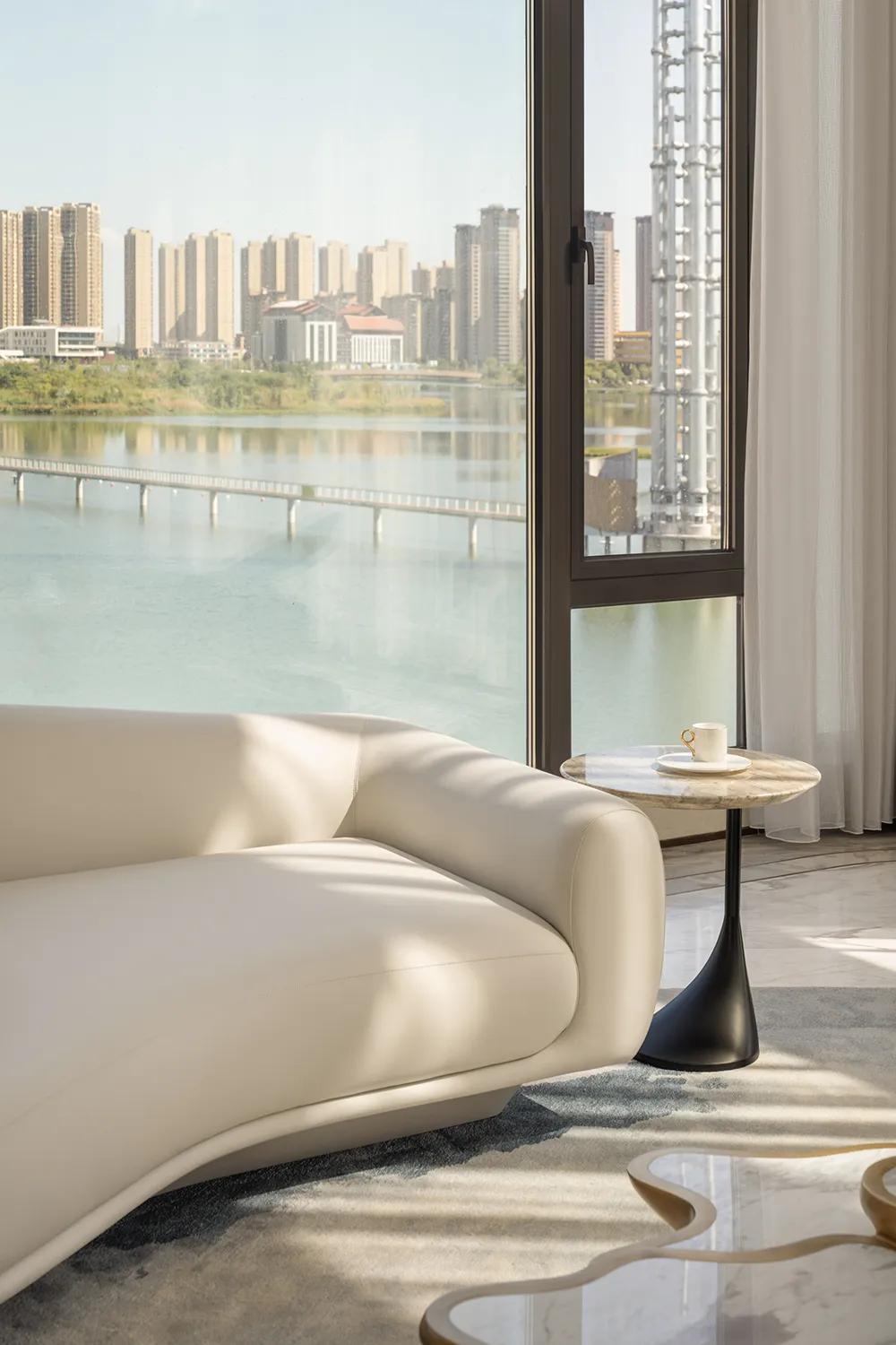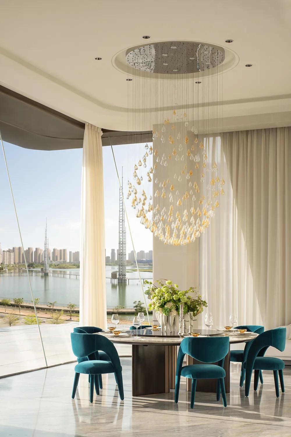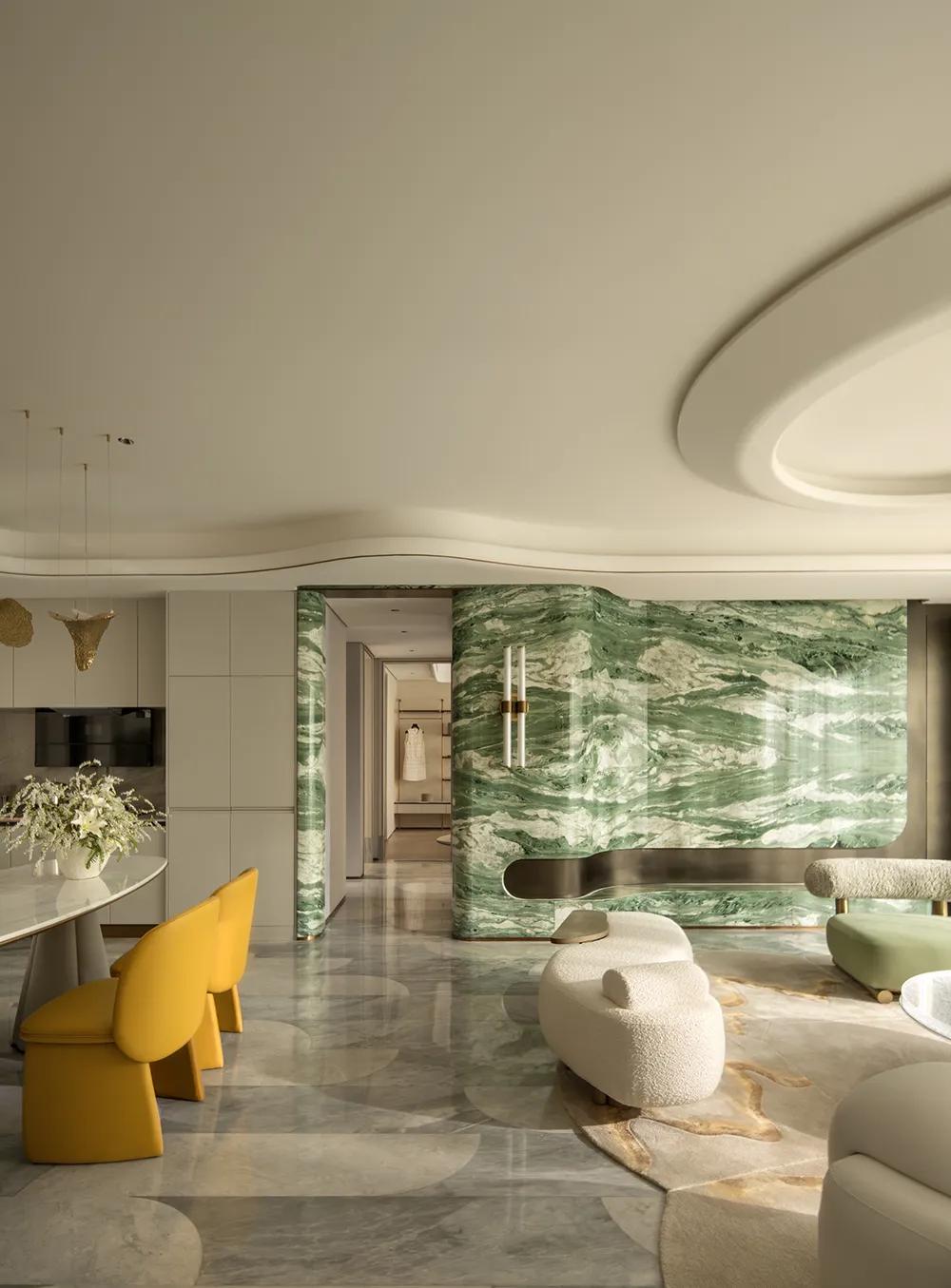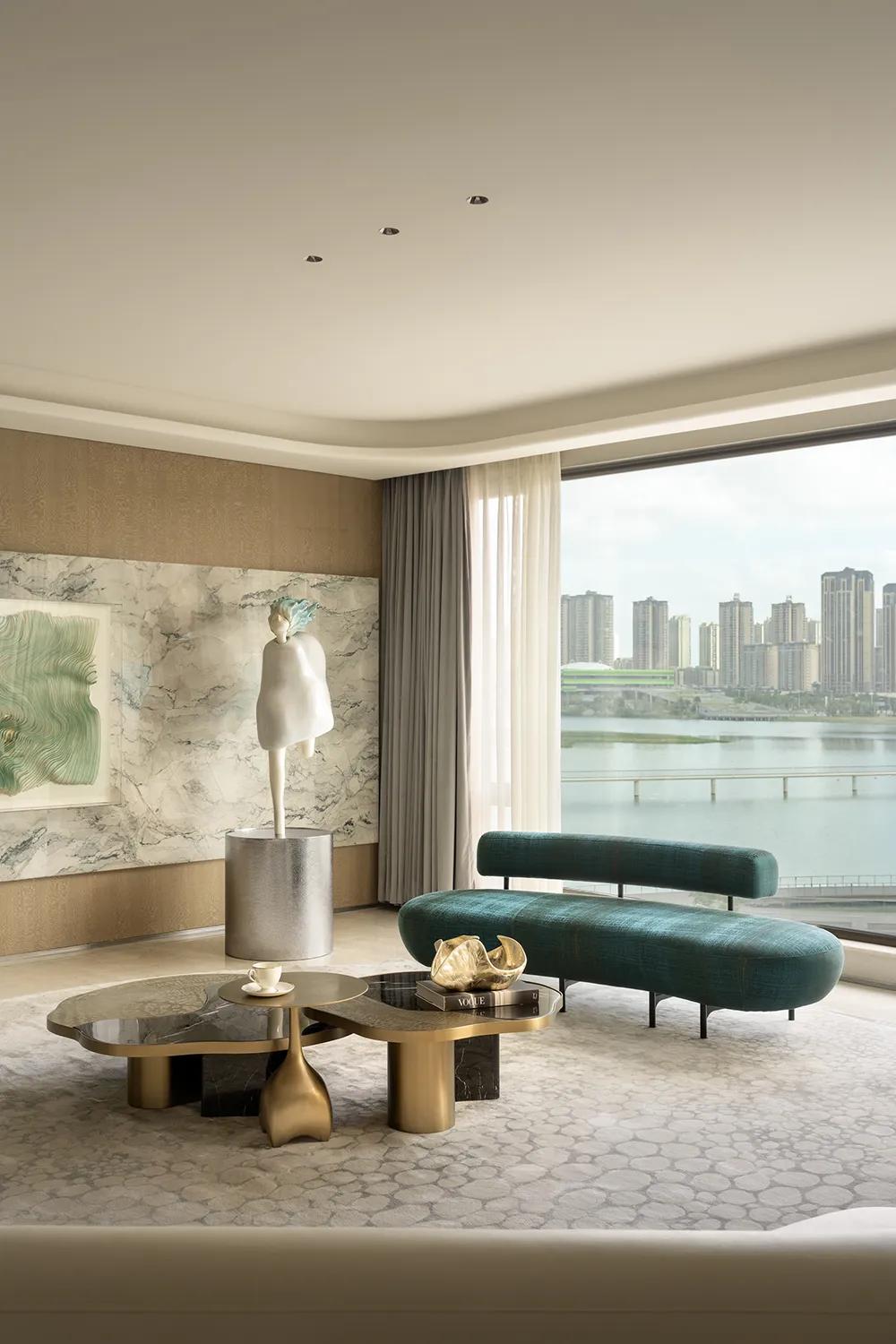 270°观景界面将湖景最大限度地引入室内,特殊艺术涂料在柔光中呈现近似洞石的细腻肌理,让山海之间潮汐、水雾与岩层的自然印象,转化为空间内部更安静的流动语言。