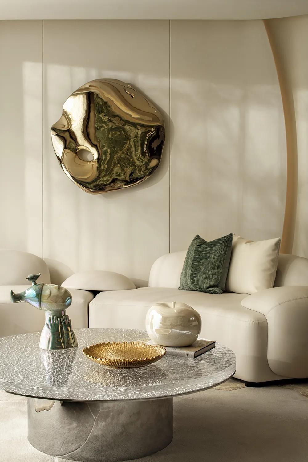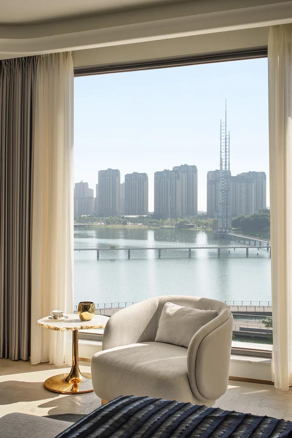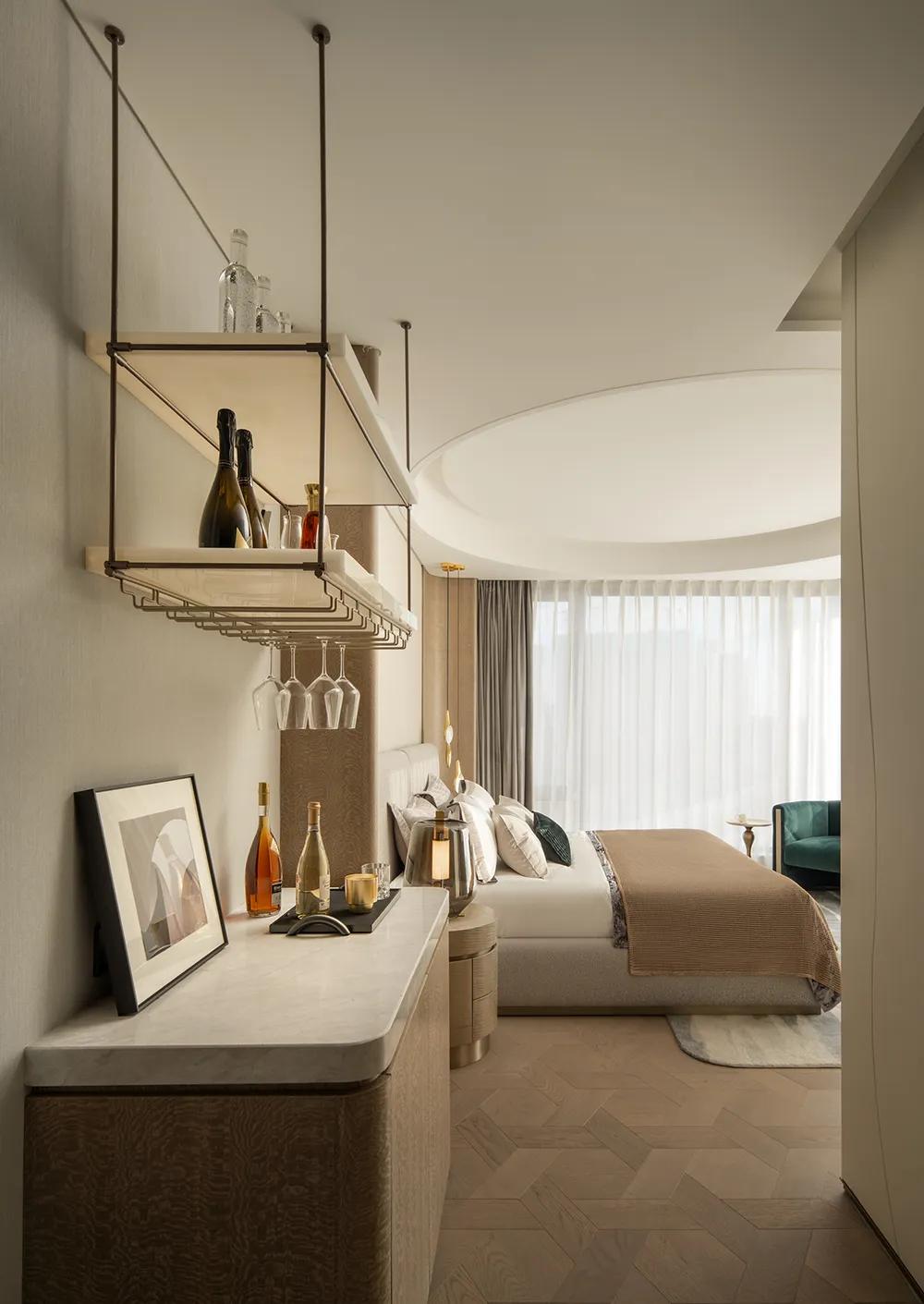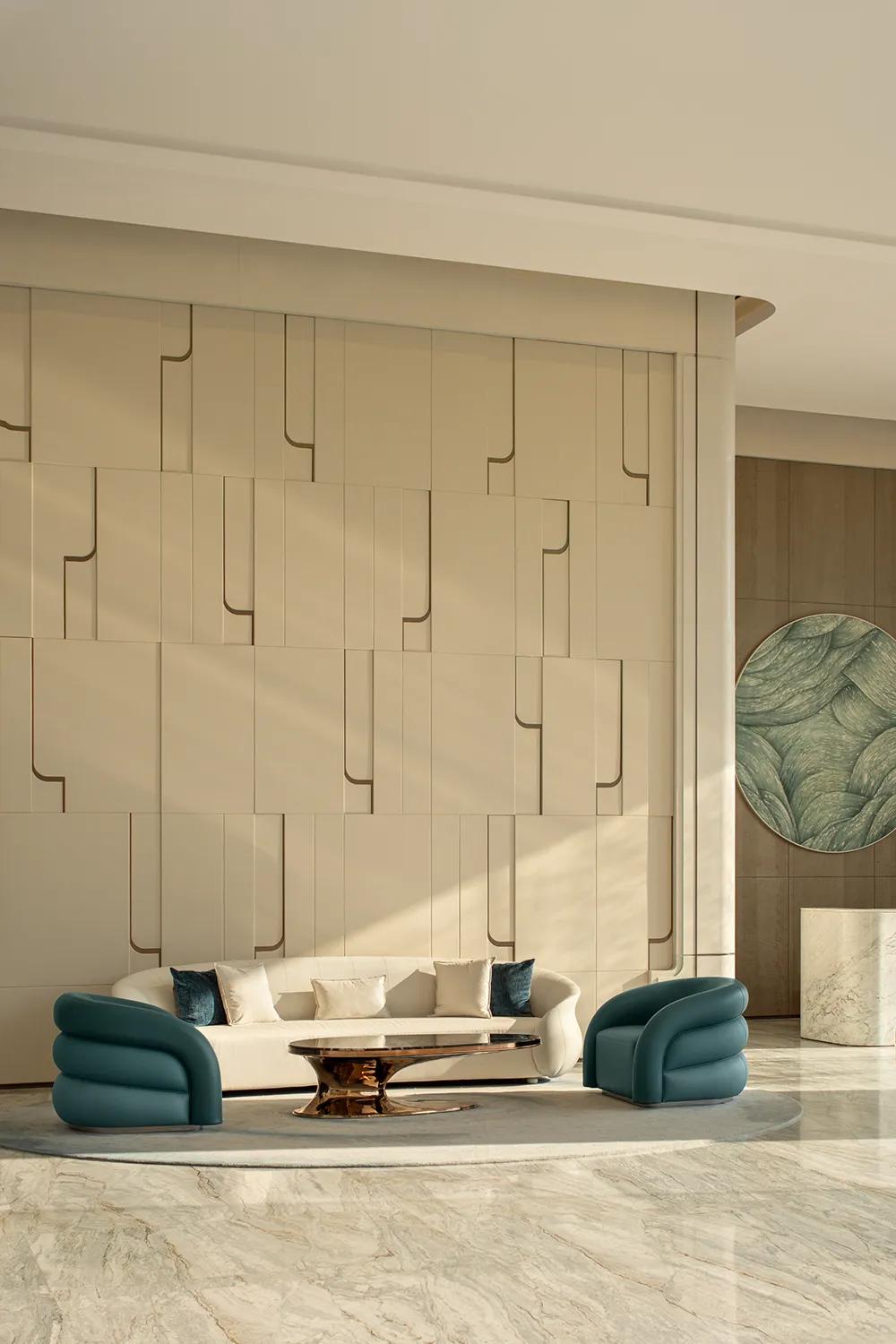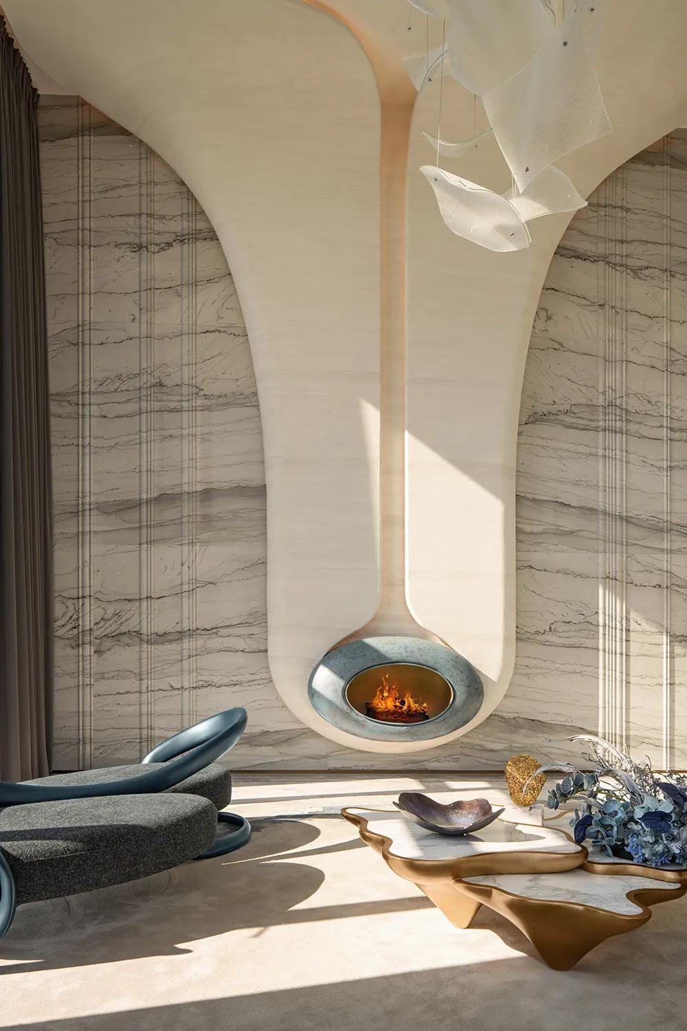 270°观景界面将湖景最大限度地引入室内,特殊艺术涂料在柔光中呈现近似洞石的细腻肌理,让山海之间潮汐、水雾与岩层的自然印象,转化为空间内部更安静的流动语言。