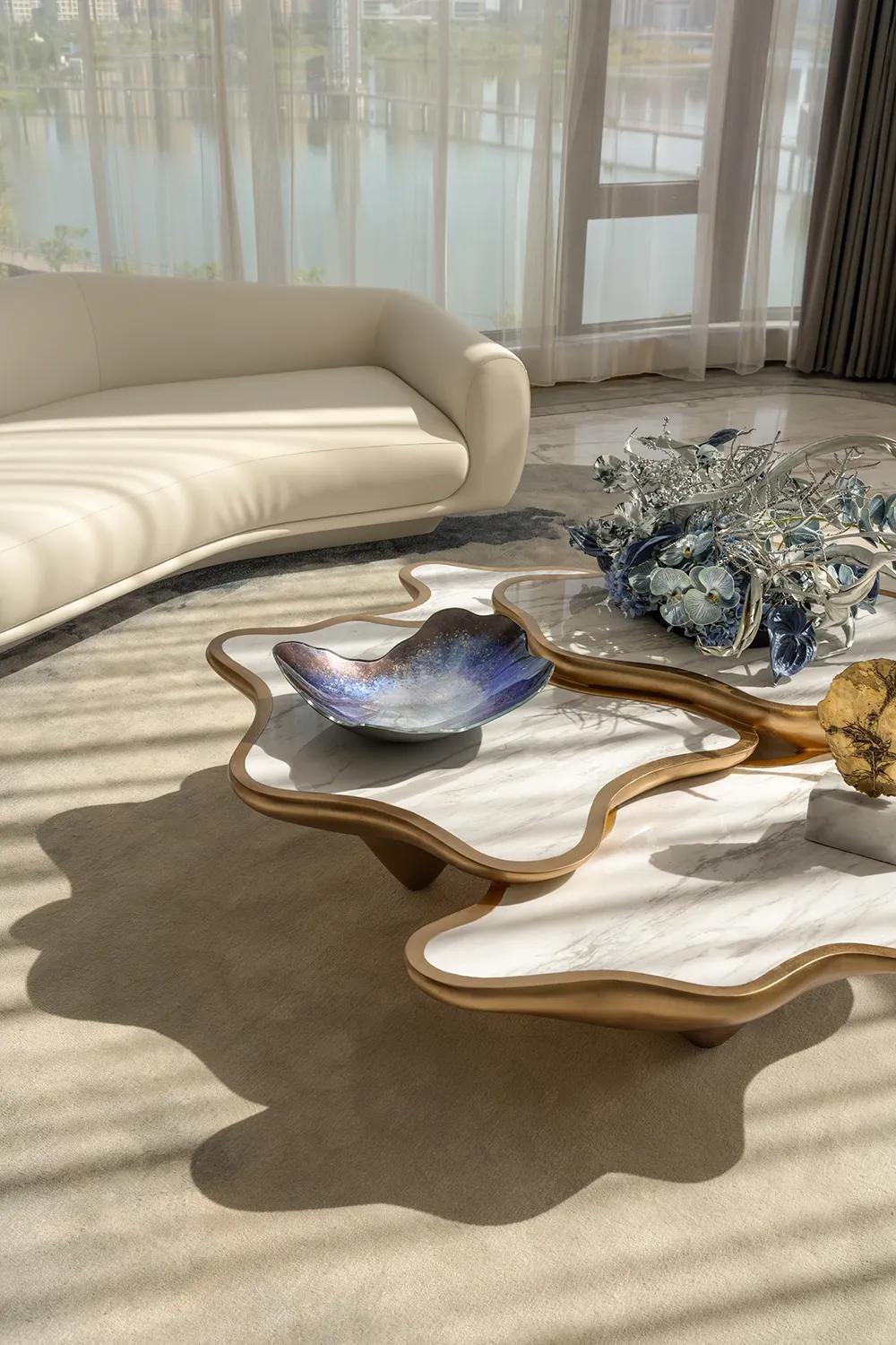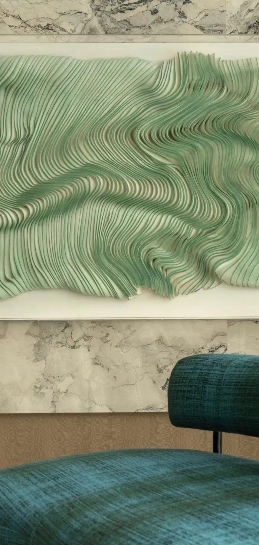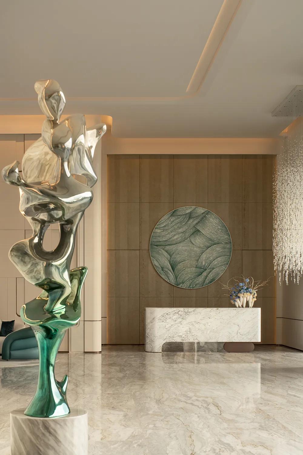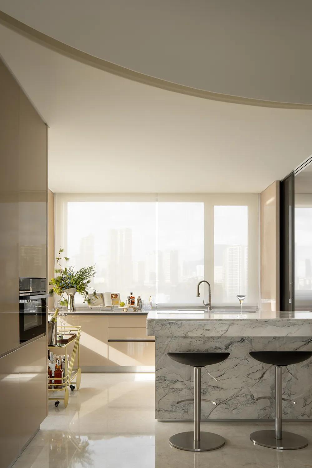 270°观景界面将湖景最大限度地引入室内,特殊艺术涂料在柔光中呈现近似洞石的细腻肌理,让山海之间潮汐、水雾与岩层的自然印象,转化为空间内部更安静的流动语言。