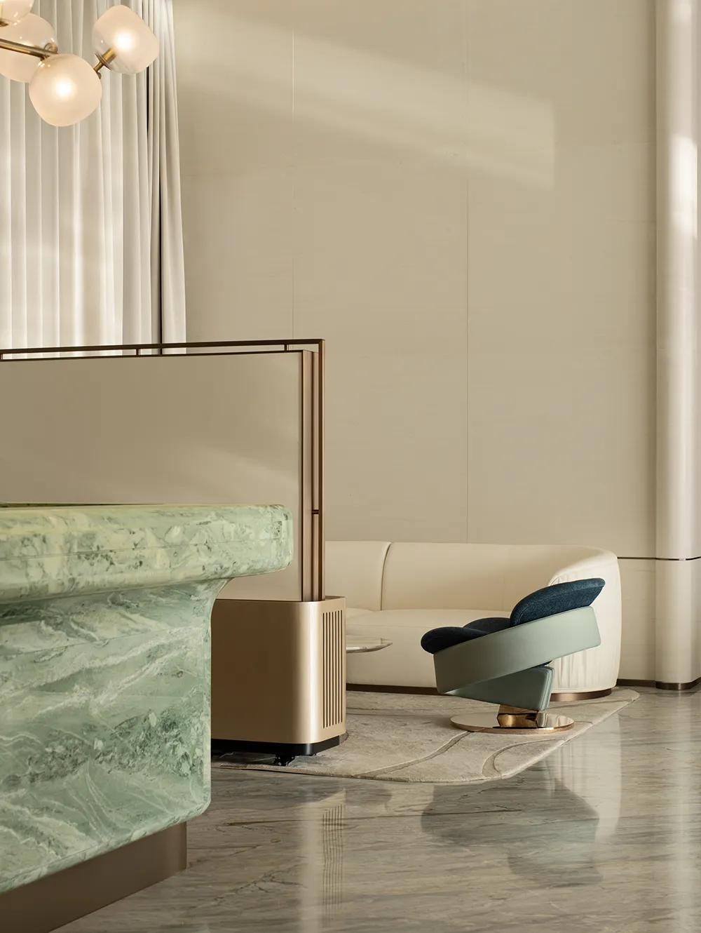 山海的灵气与流动感,在设计里体现为有机线条、温润的光影与高质感的材料结合,使整个空间既有头排产品应有的丰盛感,又始终保持着诗性的留白。