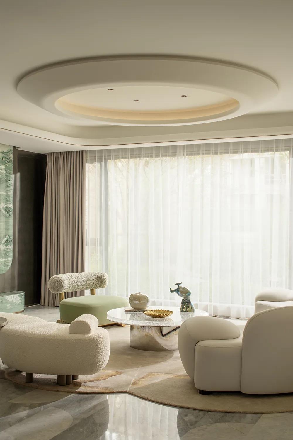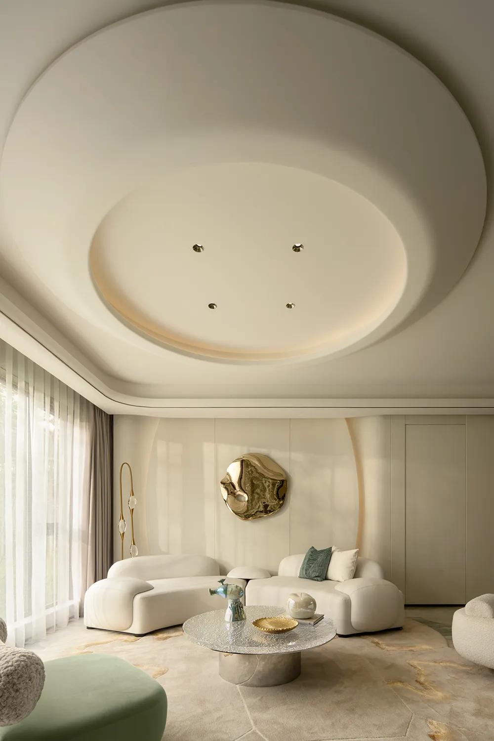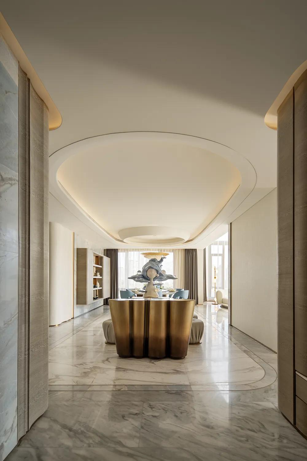 玄关以圆弧天花与隐藏灯光展开温柔的入场序章,进入客厅空间则是整套空间的精神核心。