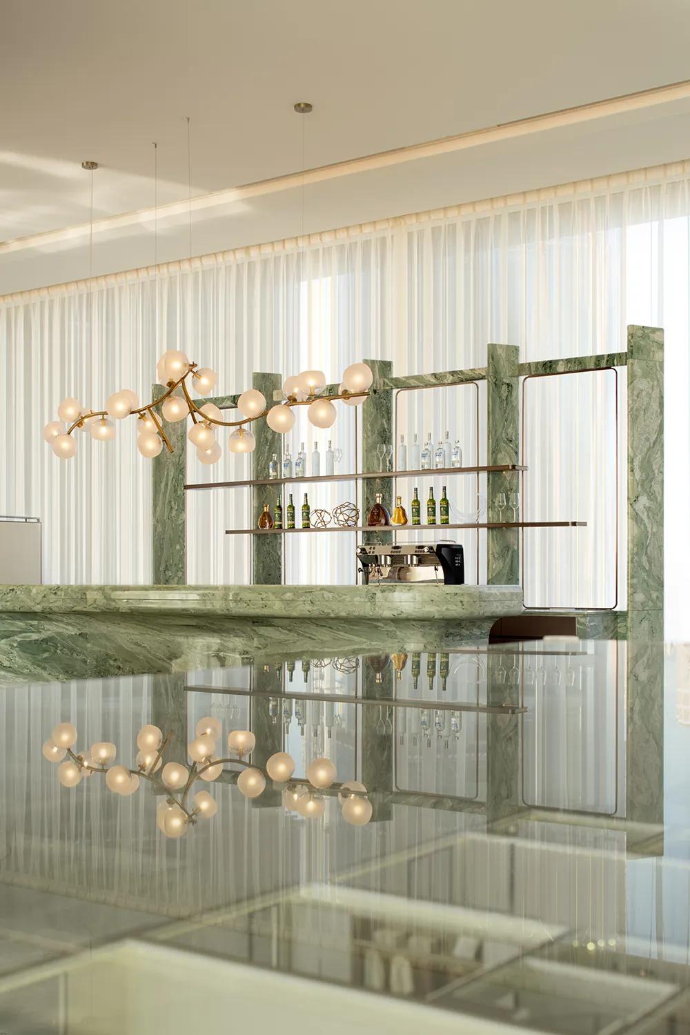 餐厅与茶室以圆桌、雾感灯饰与岩板墙面构成共享而有仪式感的开放场域。