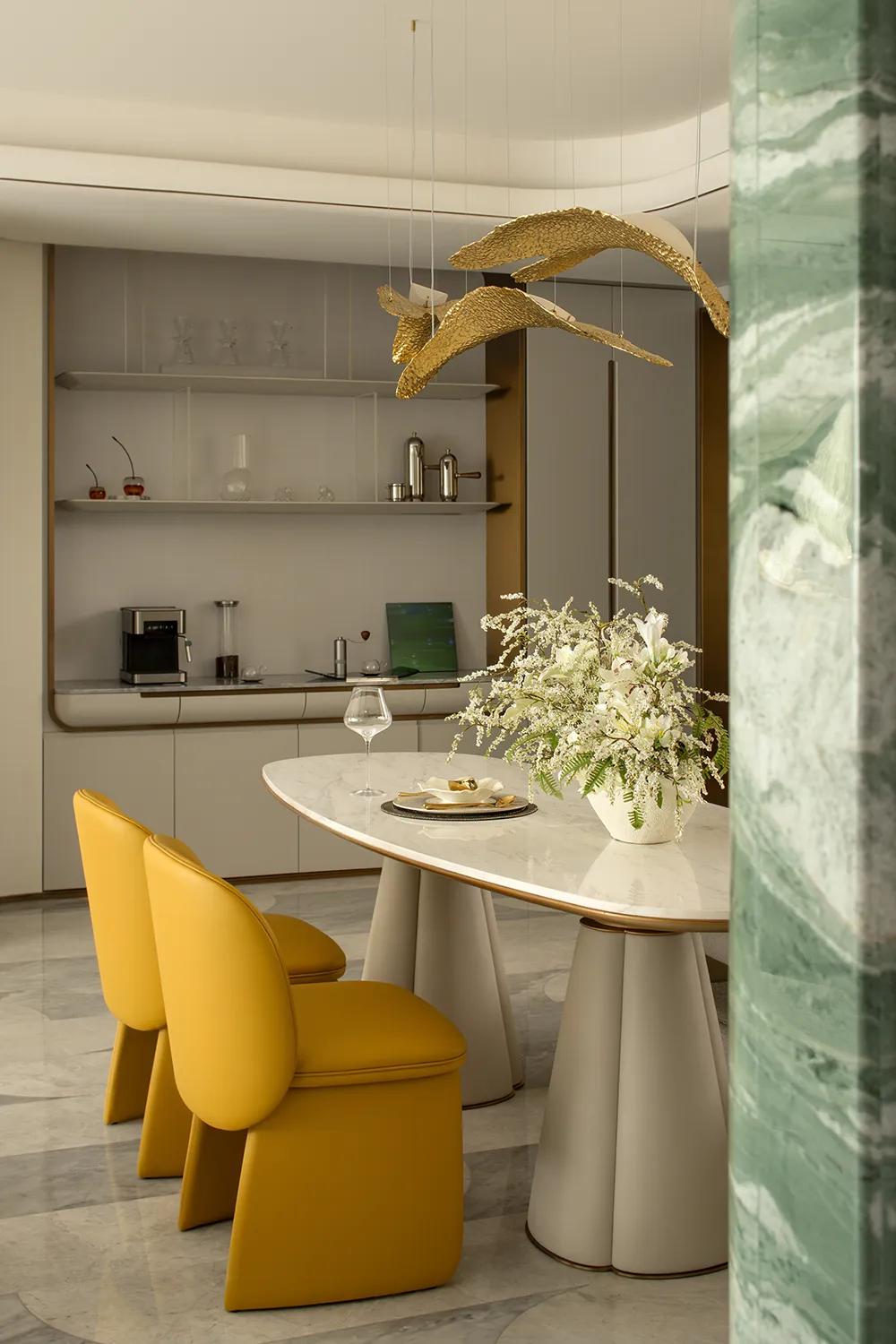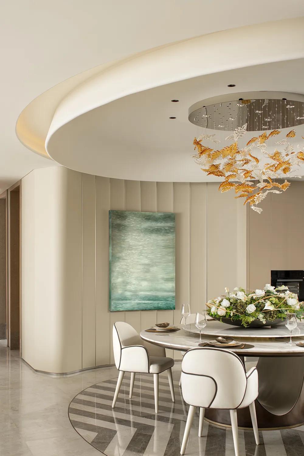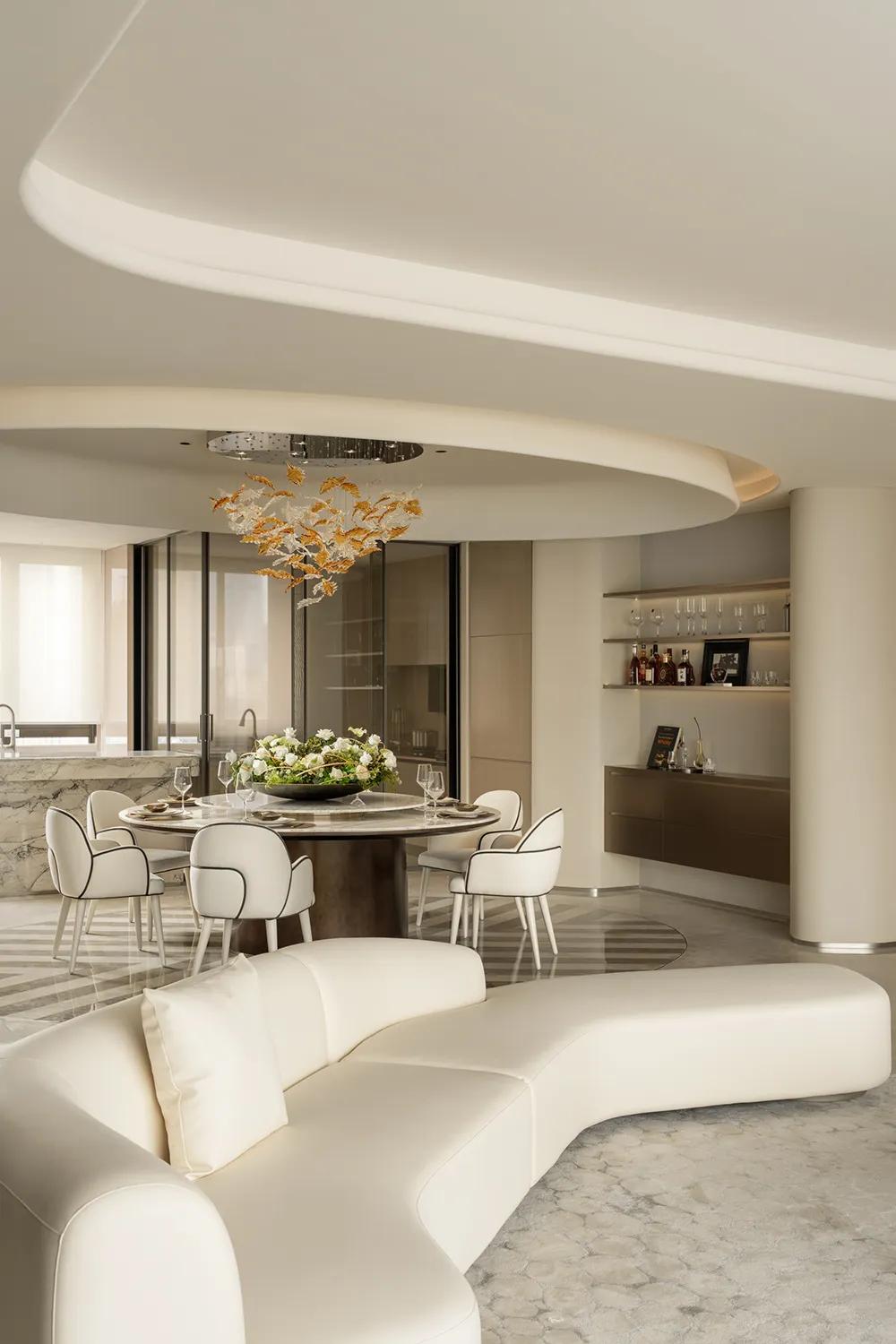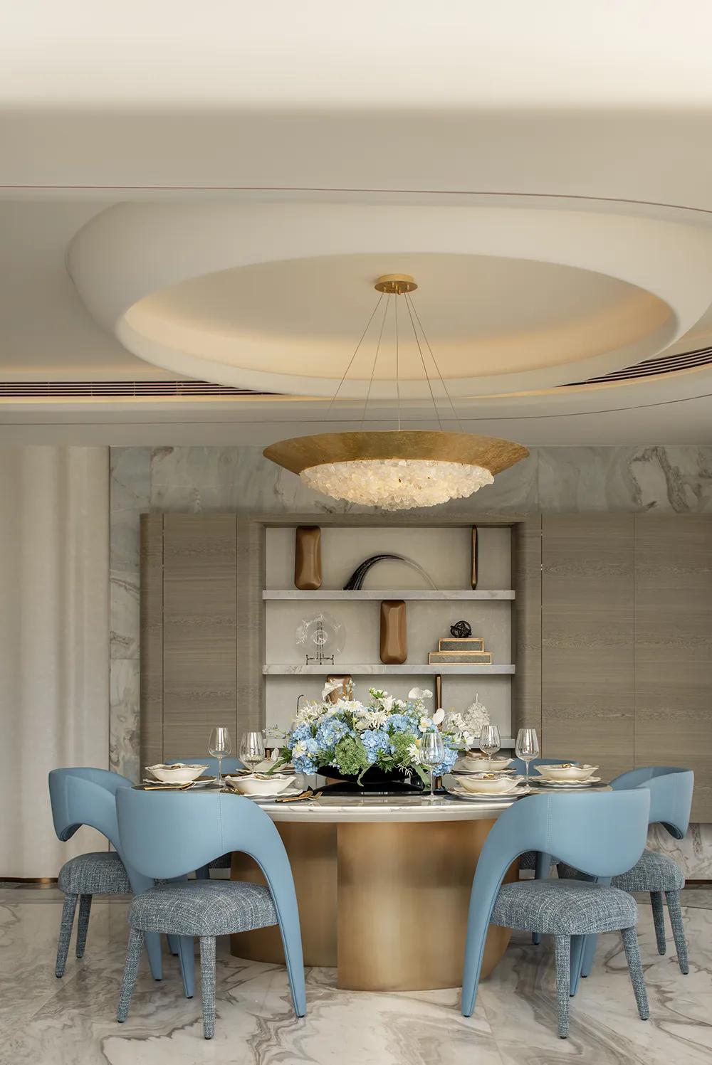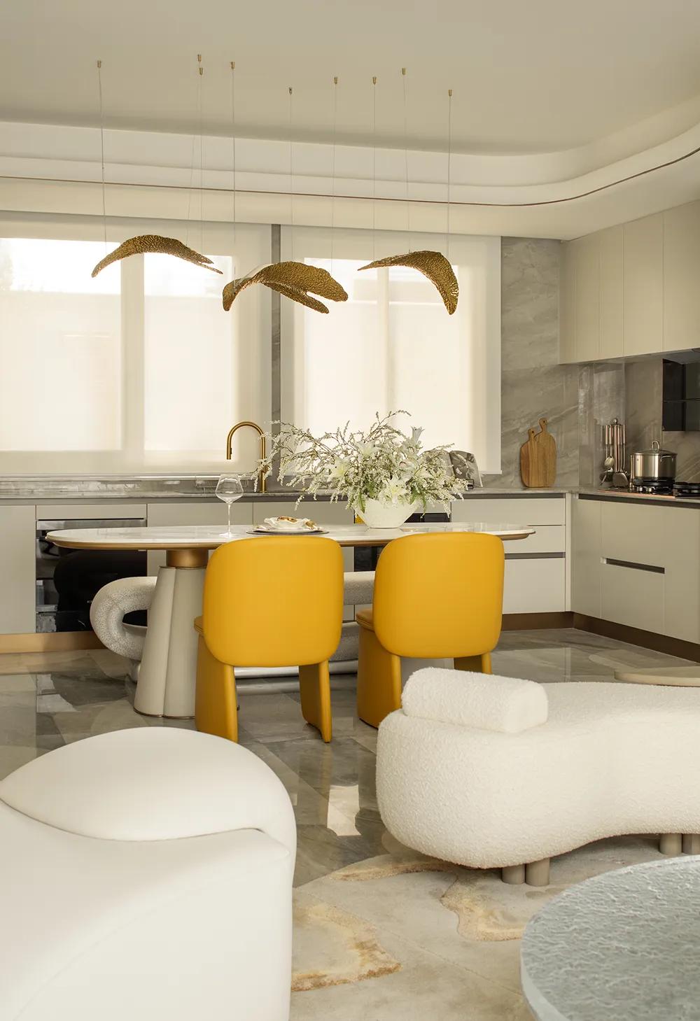 圆桌、岛台与茶叙区域彼此串联,让用餐、交流、陪伴与会客在同一空间中自然发生,让日常的热闹与从容得以并存。