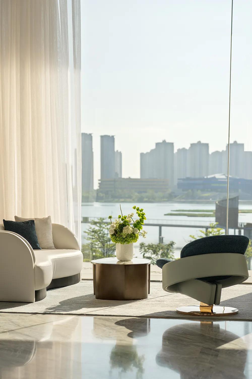 二层空间转向更为开阔而从容的气质,洽谈区正对约15米宽的整面落地玻璃,将玉湖景致引入室内。