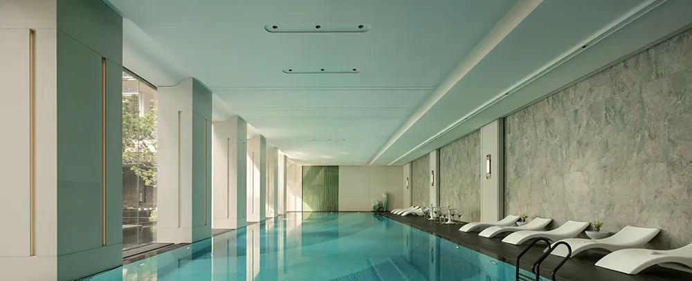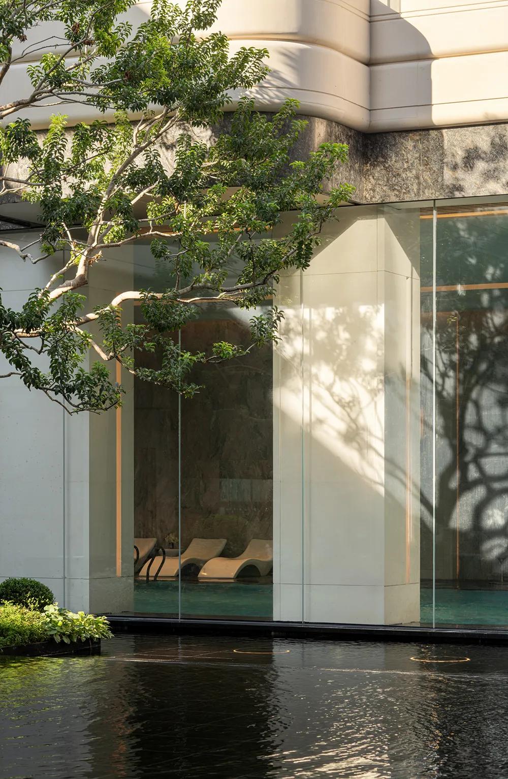 24米泳池与三泳道尺度提供了充足的舒展感,池底的大波浪马赛克图案延续玉湖主题,立面则通过魔晶石、金属与绿意形成更具现代度假感的界面关系,泳池旁岩板的像素化拼接,既丰富了视觉肌理,也呼应了庭院景致的层次变化。