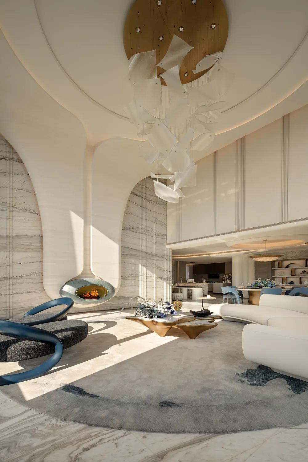 高挑天花下,珍珠灯串如被拉长的光点垂落,浪花般延展的曲面天花与墙面共同消解了结构边界。