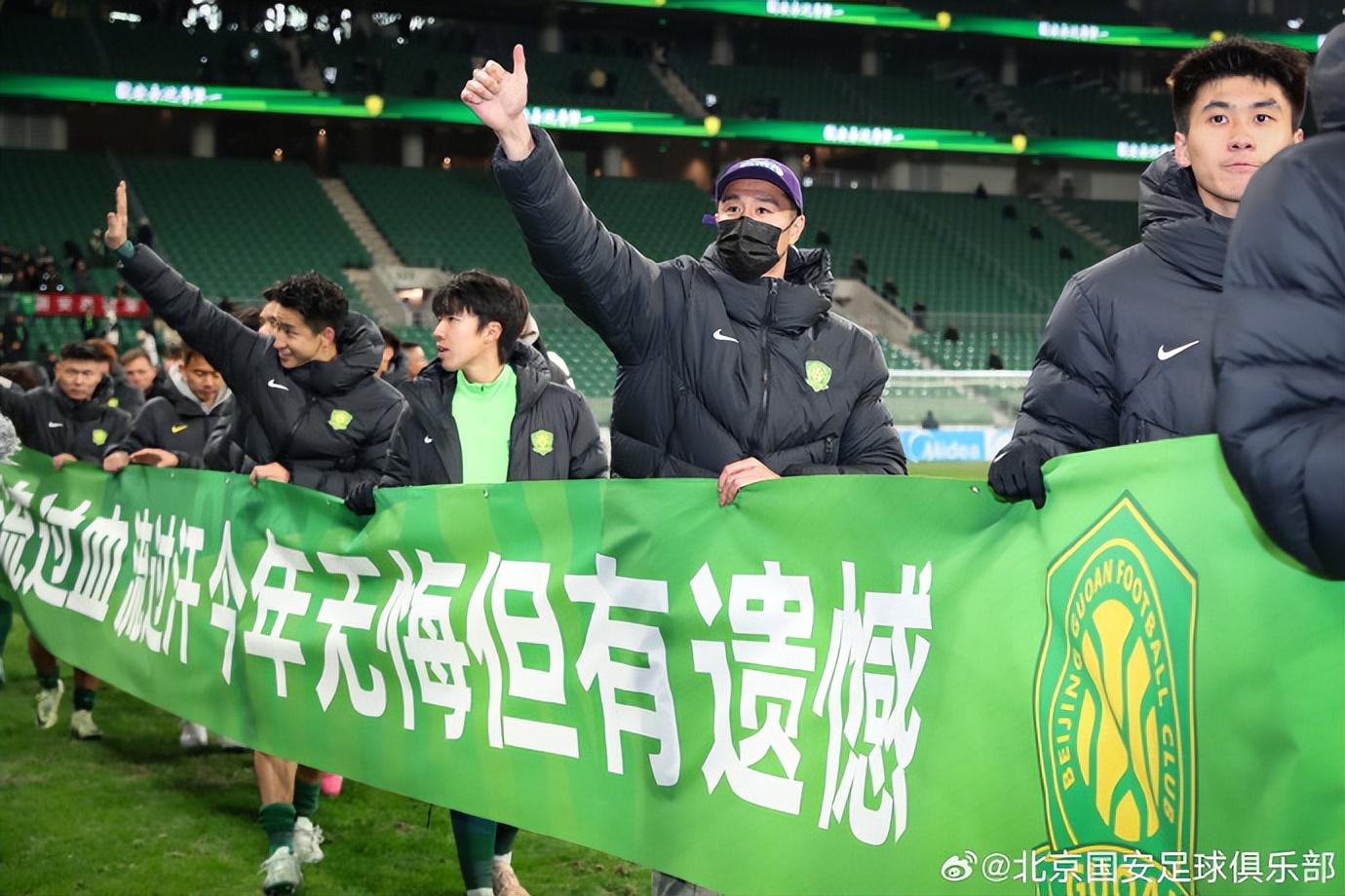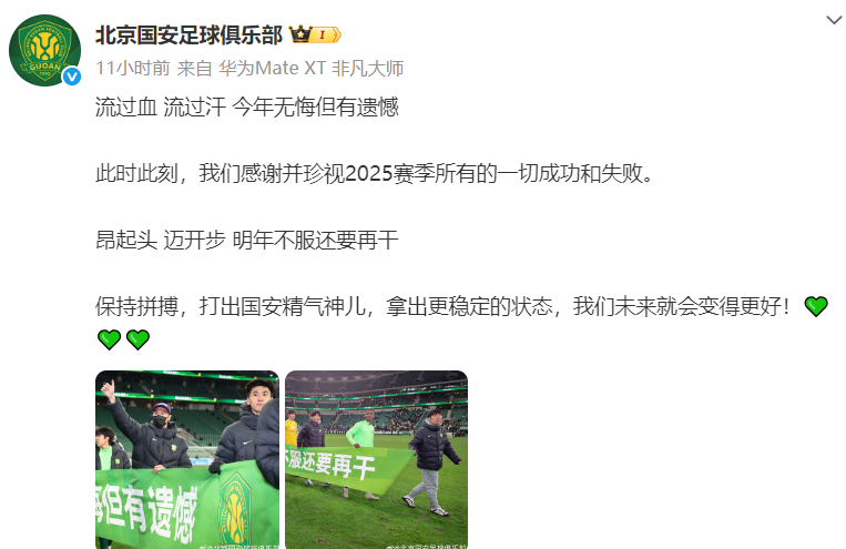赛后,国安球员拉出两张横幅,第一张上面写着:“流过血 流过汗 今年无悔但有遗憾”。第二张印着:“昂起头 迈开步 明年不服还要再干”。俱乐部官微上还打出一句话:“保持拼搏,打出国安精气神儿,拿出更稳定的状态,我们未来就会变得更好!”