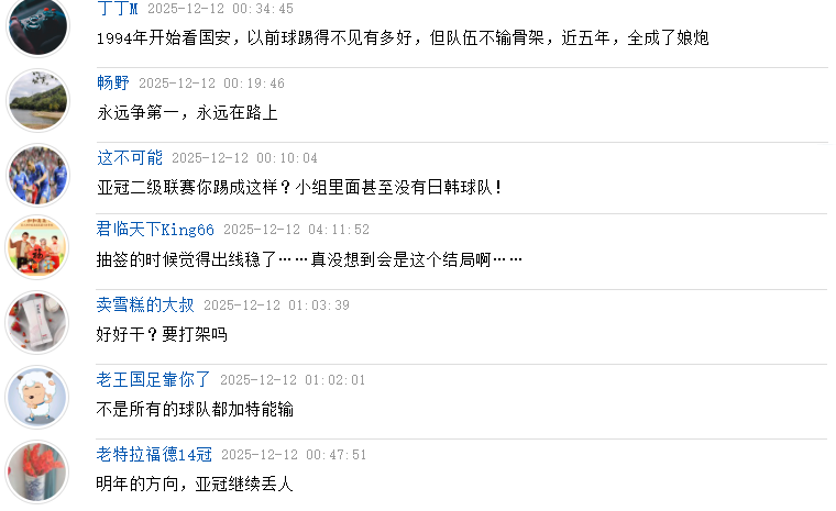 亚冠2小组最后一轮,北京国安坐镇主场以1比2不敌澳超球队麦克阿瑟FC,最终排名小组垫底,刷新中超球队参加亚冠二级联赛的新低。去年浙江队虽然也没有晋级,但好歹人家拿个小组第三,没出线是因为净胜球不占优势。再看今年北京国安的成绩:6场比赛拿4分,比排名第三的港超球队还低2分。赛后,北京国安球员拉出横幅表示“今年无悔但有遗憾”。亚冠比赛中输赢无所谓的态度让球迷看不下去了,批评北京国安精神在哪?亚冠输成这样,还无悔?